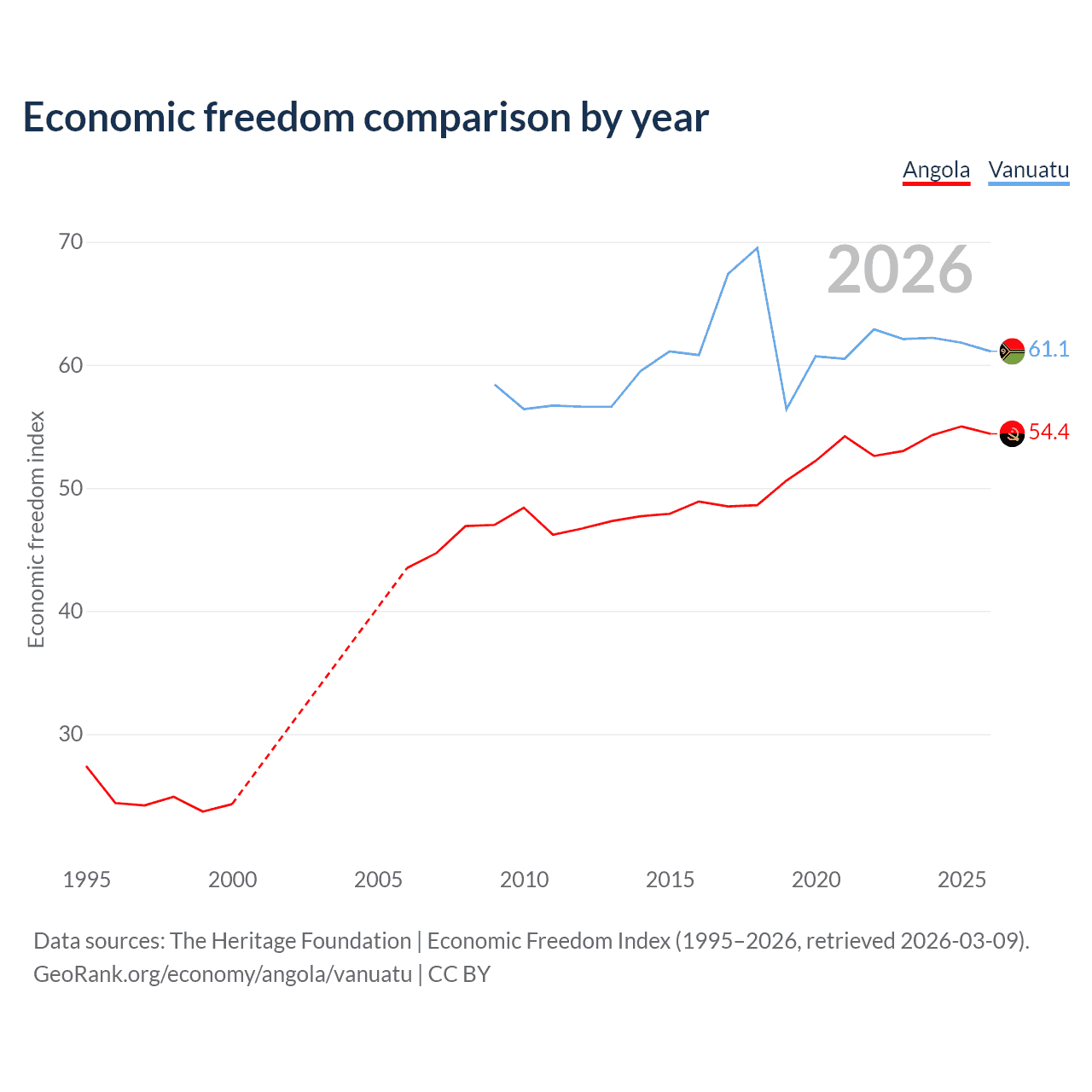 The Economic Freedom Index for Angola is 54.4, ranking 133/197, compared to 61.1 for Vanuatu, ranking 92/197. The chart above displays a comparison of annual changes in economic freedom indexes.