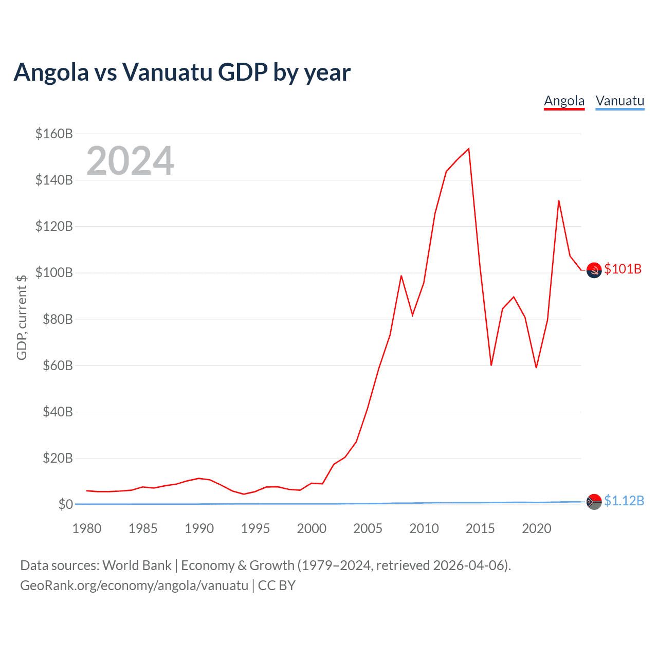 Angola has a GDP of $101B compared to $1.12B for Vanuatu, ranking 71/197 and 188/197 by economy size, respectively.