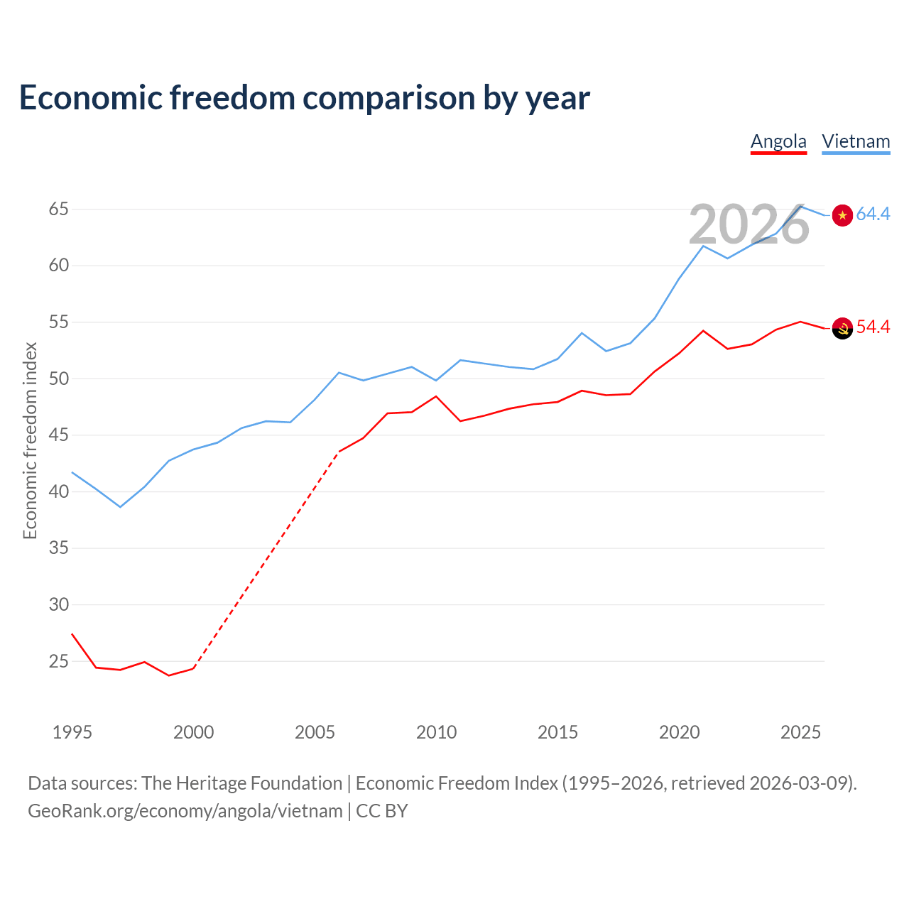 The Economic Freedom Index for Angola is 54.4, ranking 133/197, compared to 64.4 for Vietnam, ranking 73/197. The chart above displays a comparison of annual changes in economic freedom indexes.