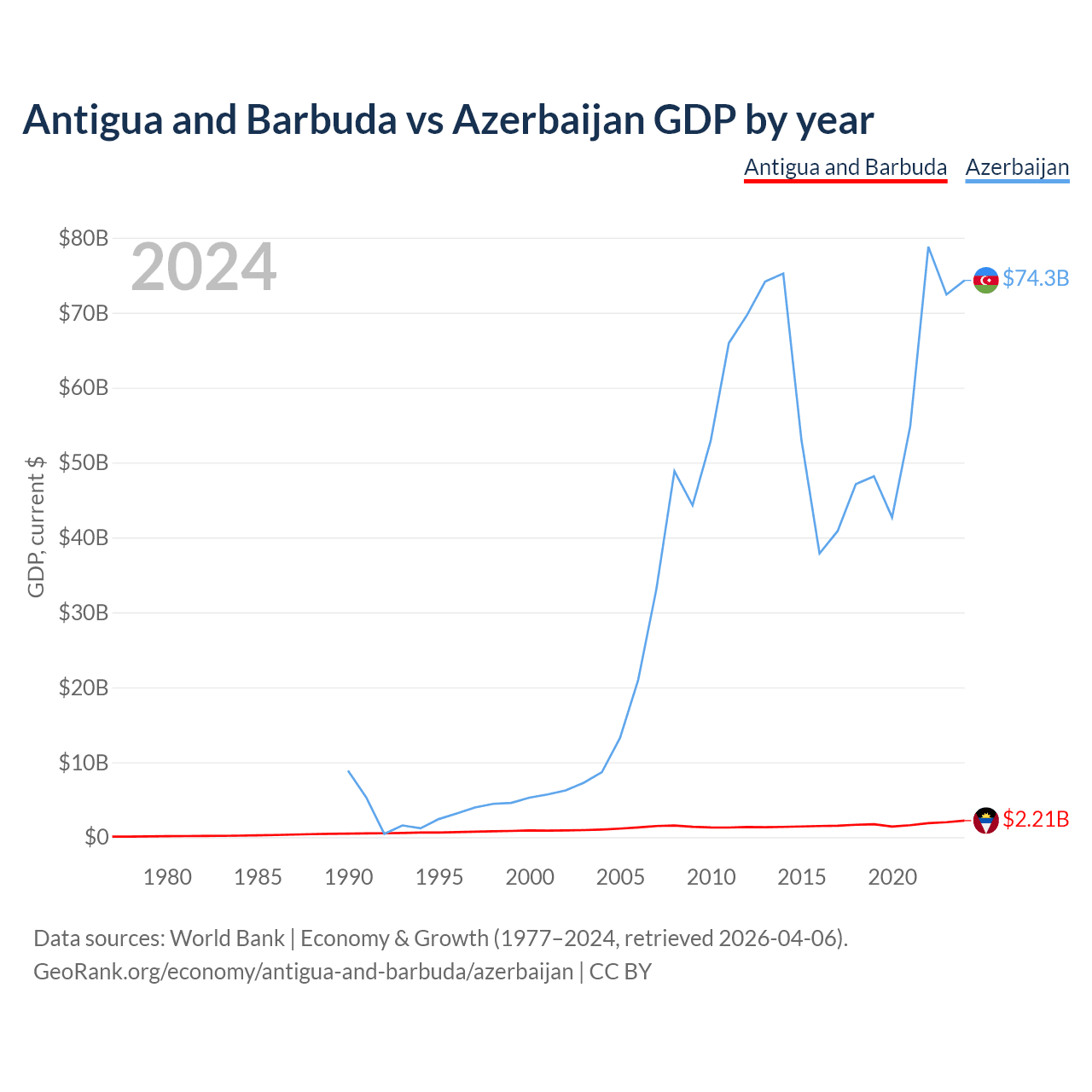 Antigua and Barbuda has a GDP of $2.21B compared to $74.3B for Azerbaijan, ranking 177/197 and 84/197 by economy size, respectively.