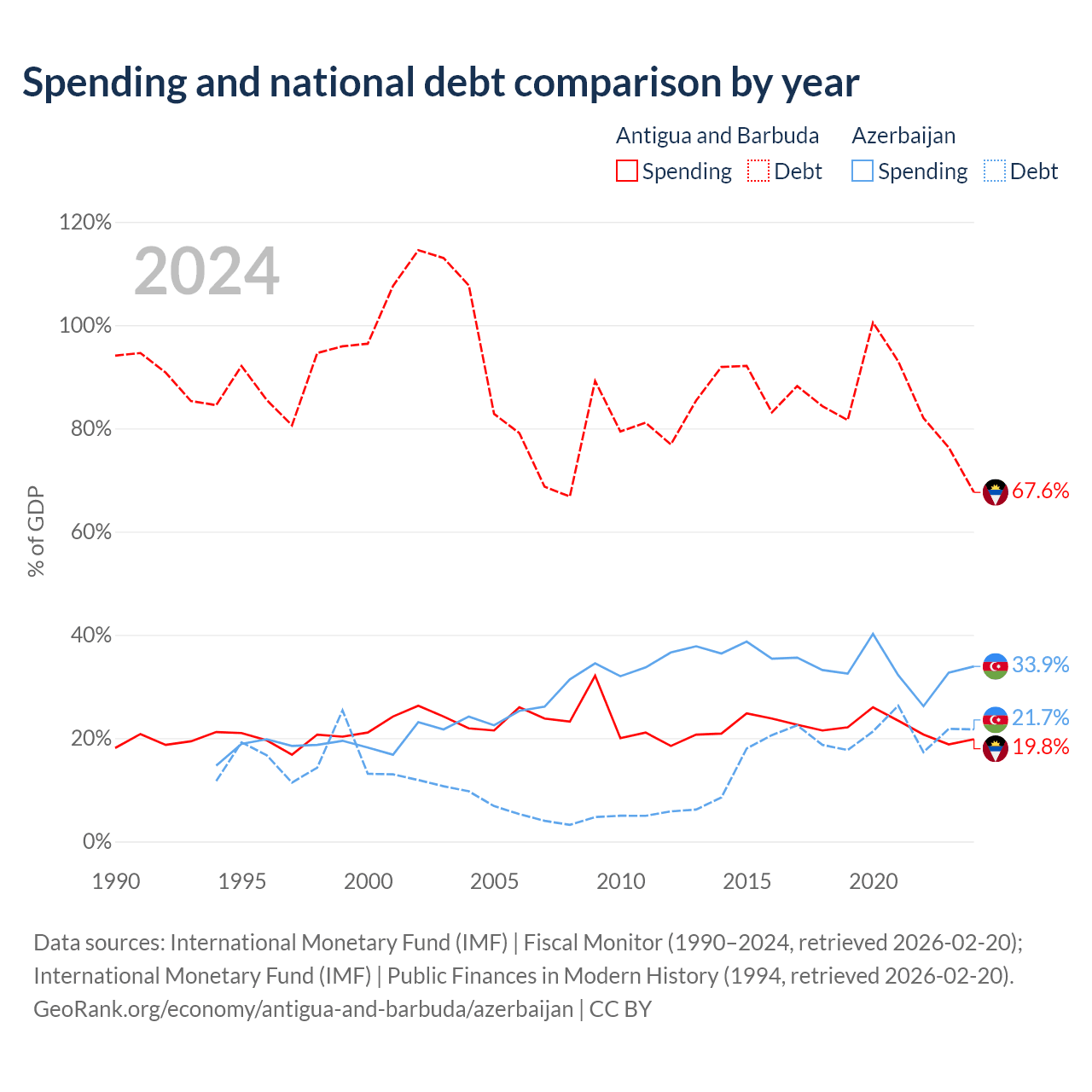 Antigua and Barbuda has $1.49B in government debt (67.6% of GDP), compared to $16.1B (21.7% of GDP) in Azerbaijan.