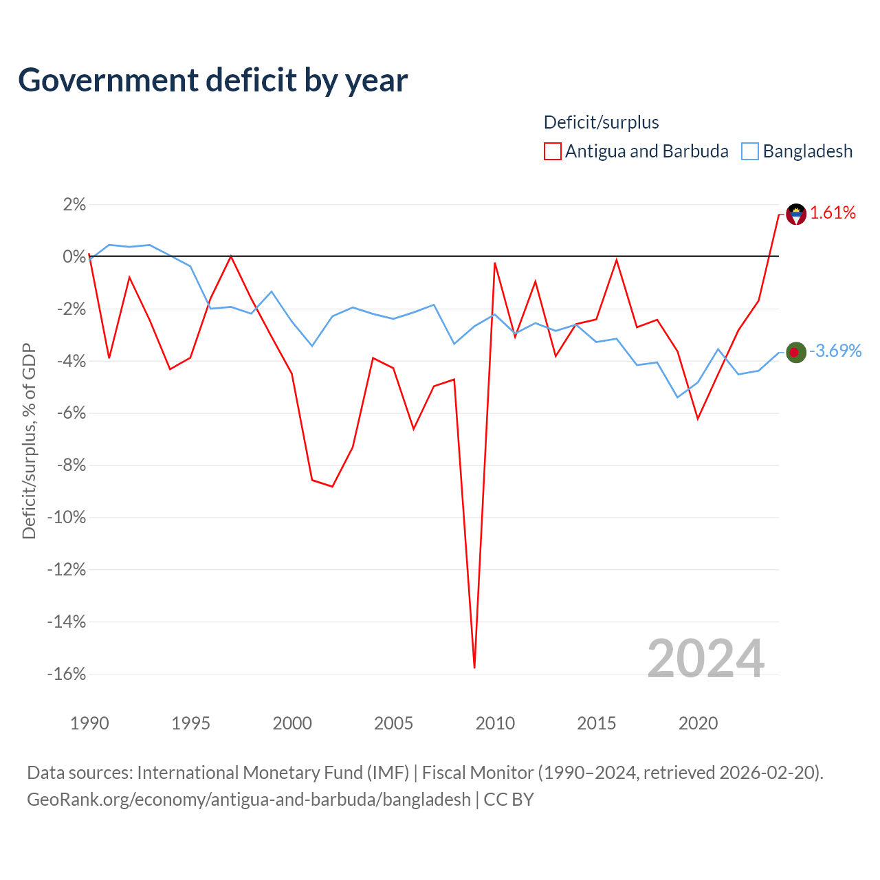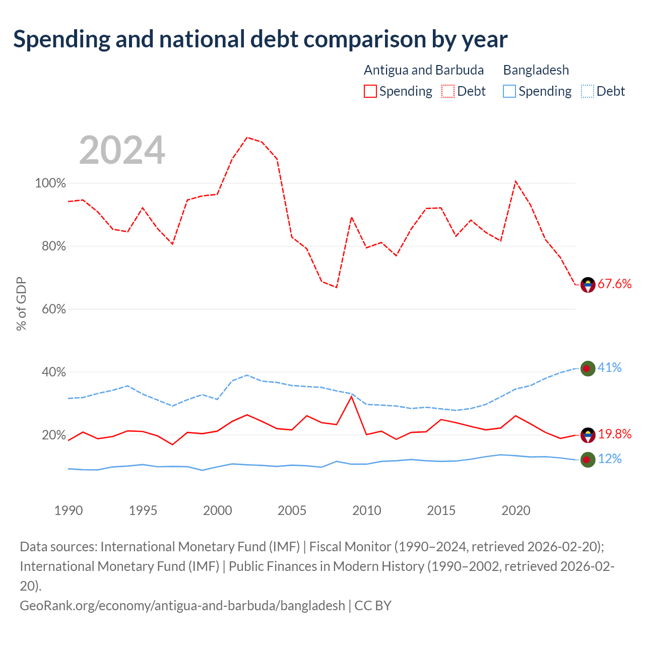 Antigua and Barbuda has $1.49B in government debt (67.6% of GDP), compared to $184B (41% of GDP) in Bangladesh.