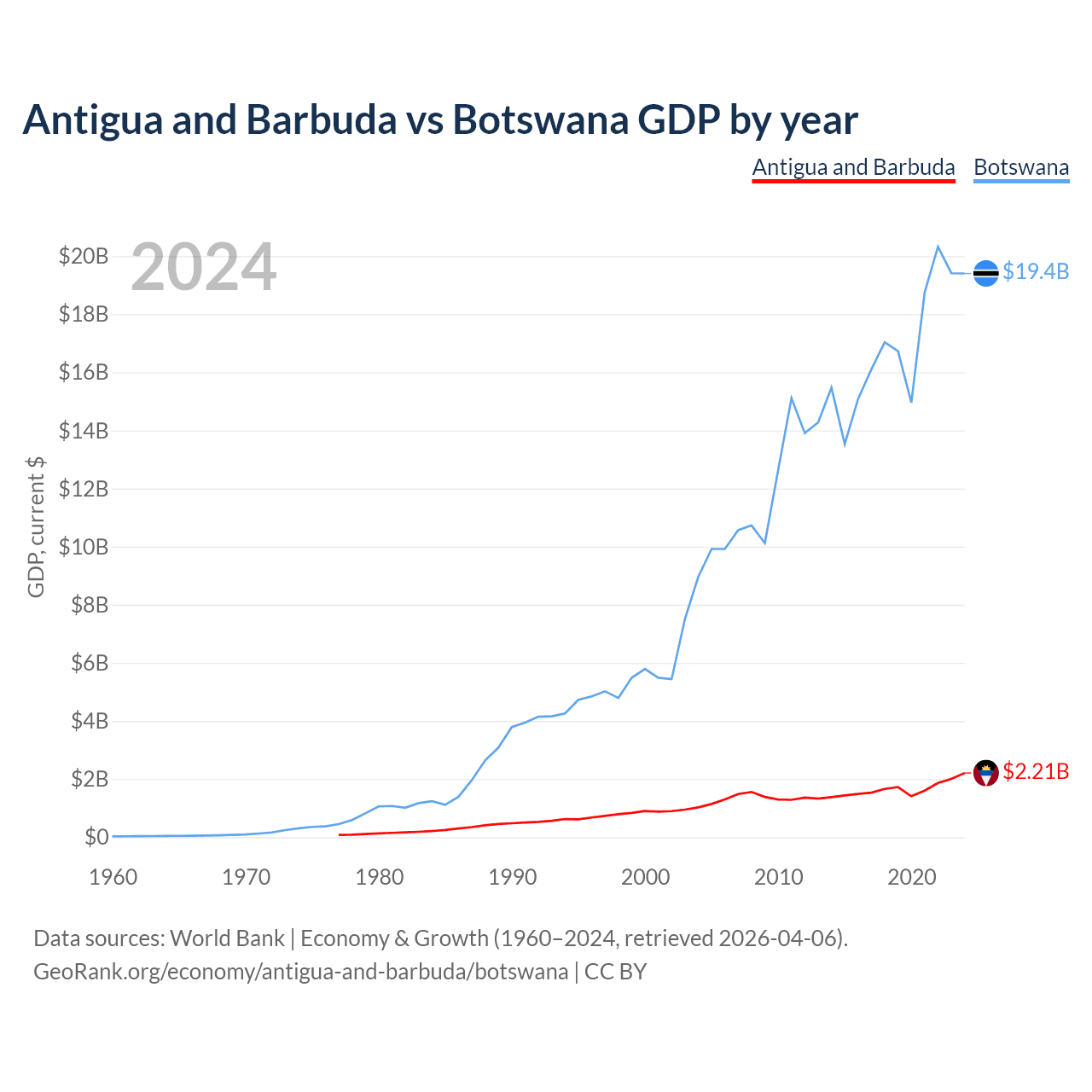 Antigua and Barbuda has a GDP of $2.21B compared to $19.4B for Botswana, ranking 177/197 and 133/197 by economy size, respectively.
