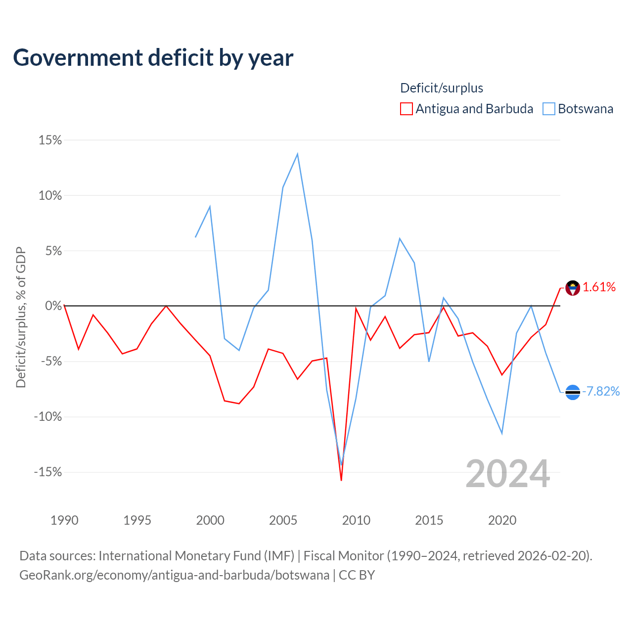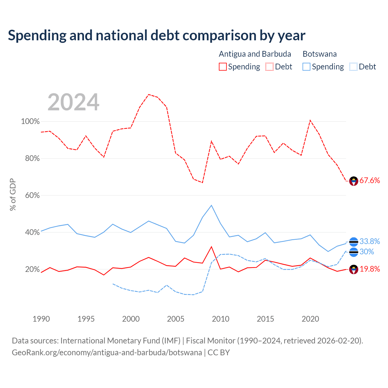 Antigua and Barbuda has $1.49B in government debt (67.6% of GDP), compared to $5.82B (30% of GDP) in Botswana.