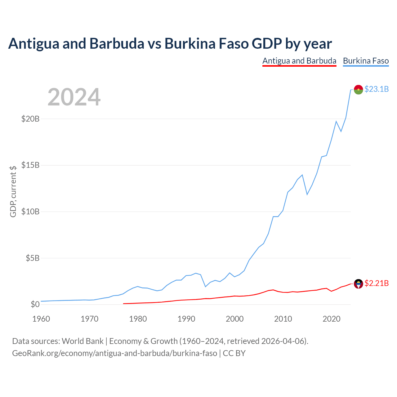 Antigua and Barbuda has a GDP of $2.21B compared to $23.1B for Burkina Faso, ranking 177/197 and 122/197 by economy size, respectively.