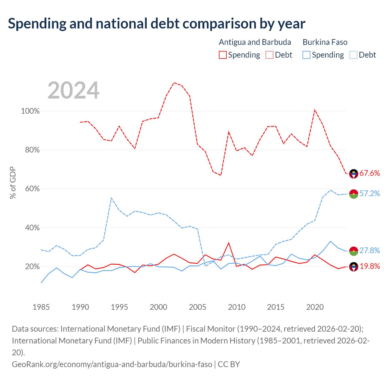 Antigua and Barbuda has $1.49B in government debt (67.6% of GDP), compared to $13.2B (57.2% of GDP) in Burkina Faso.