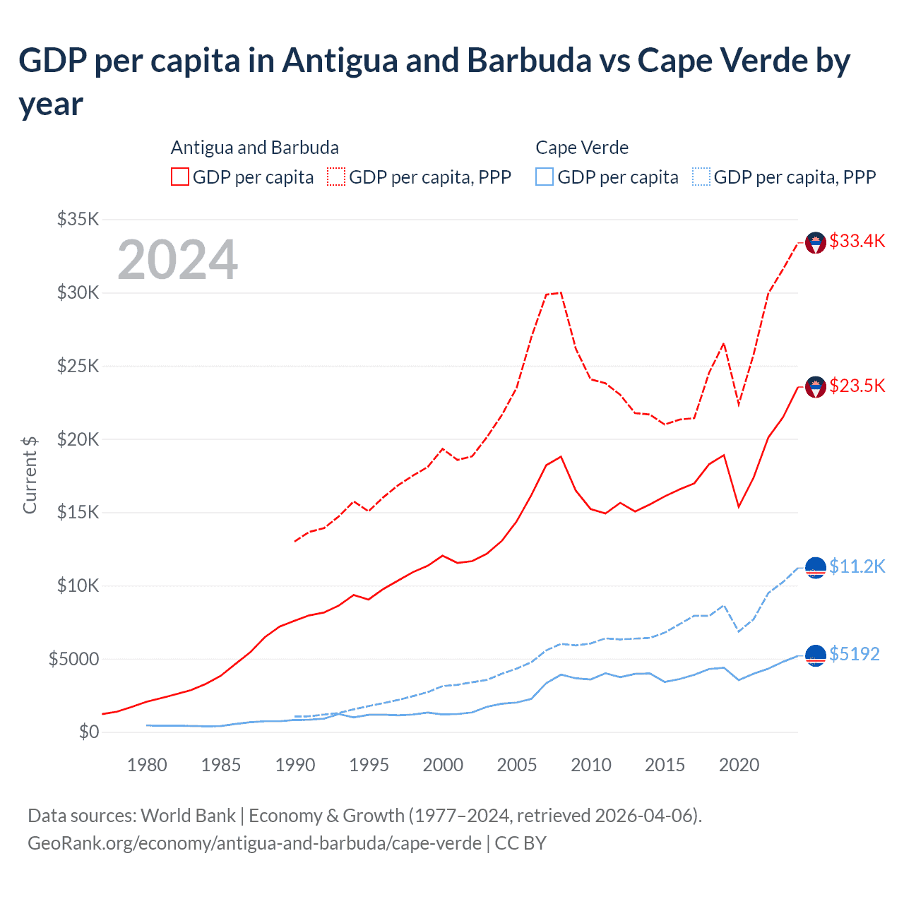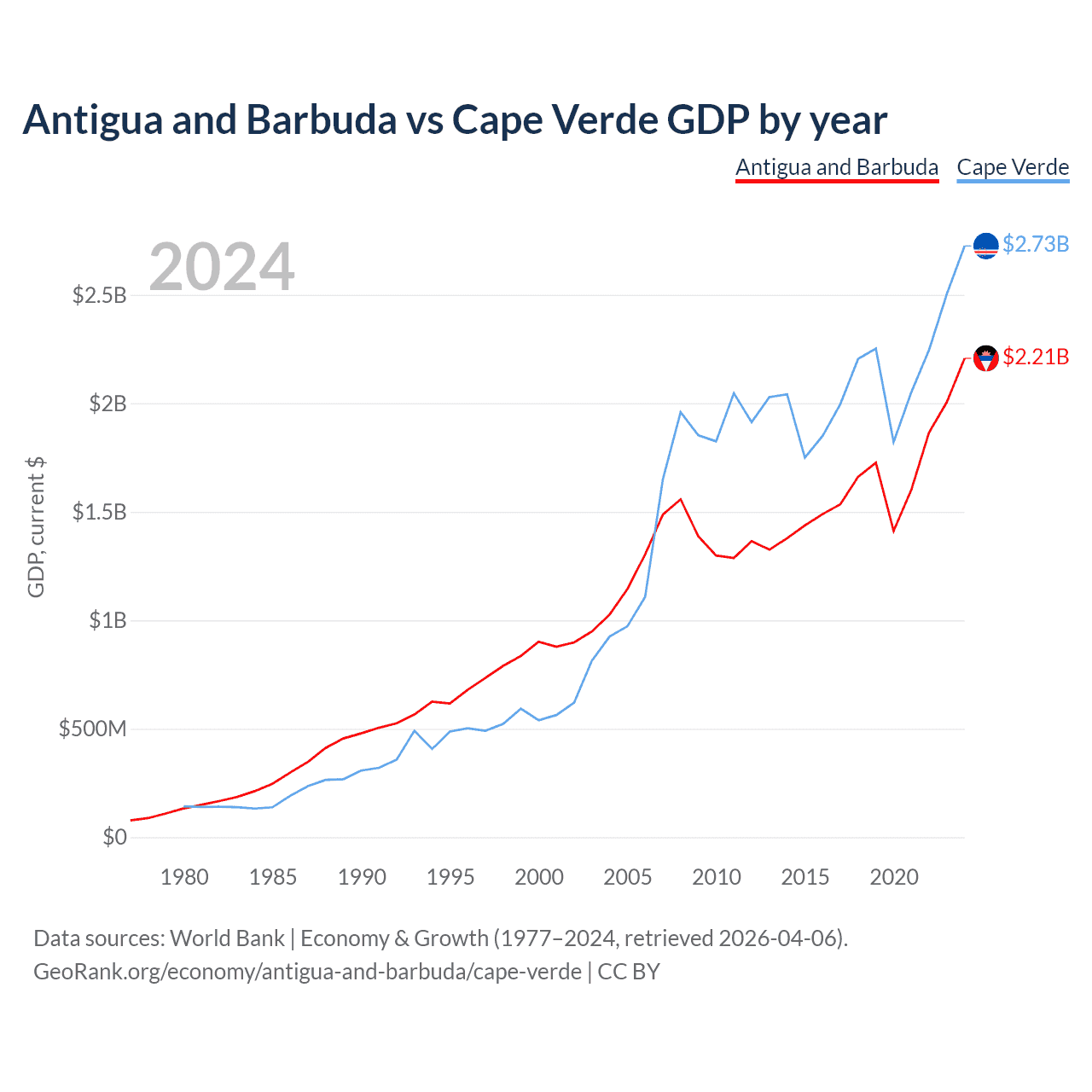 Antigua and Barbuda has a GDP of $2.21B compared to $2.73B for Cape Verde, ranking 177/197 and 172/197 by economy size, respectively.