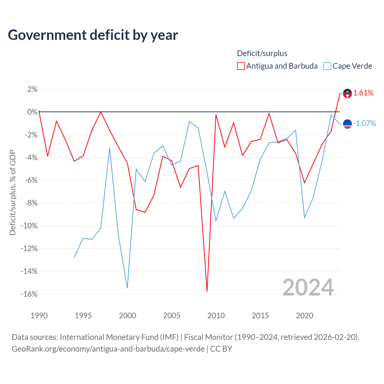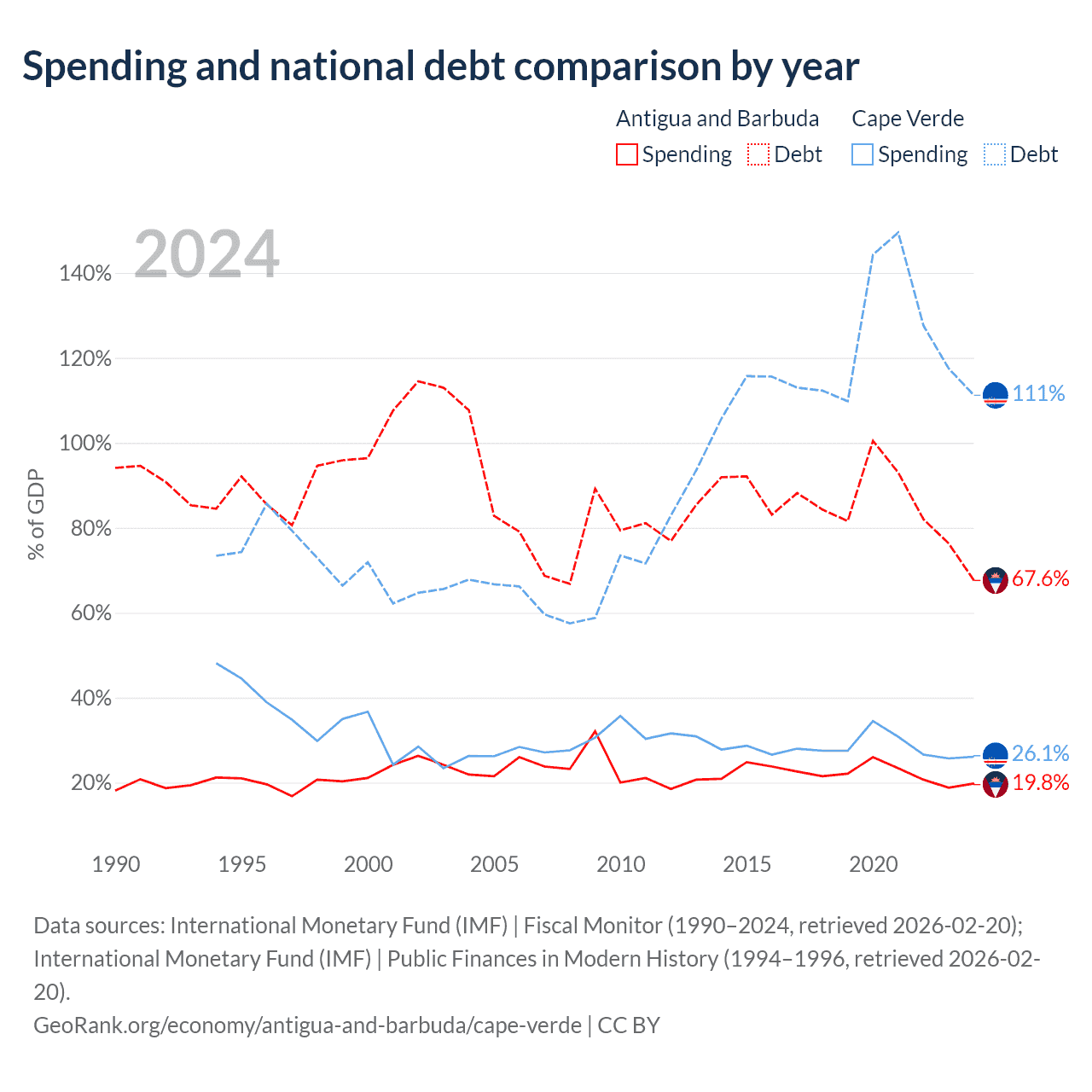 Antigua and Barbuda has $1.49B in government debt (67.6% of GDP), compared to $3.03B (111.2% of GDP) in Cape Verde.