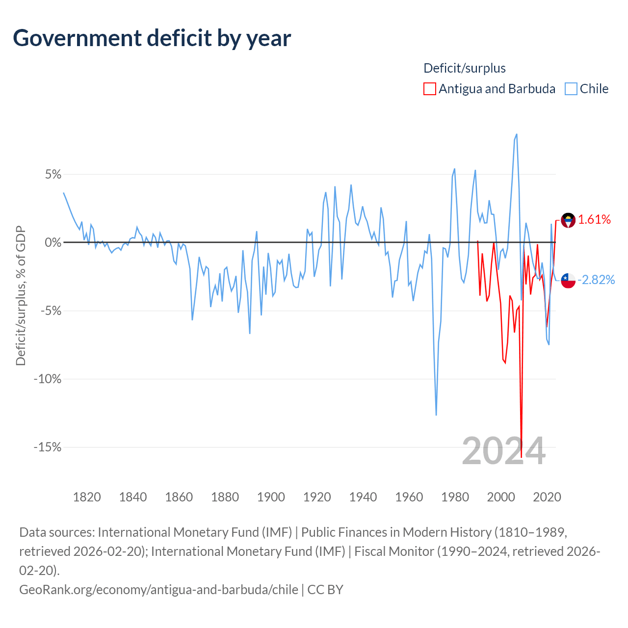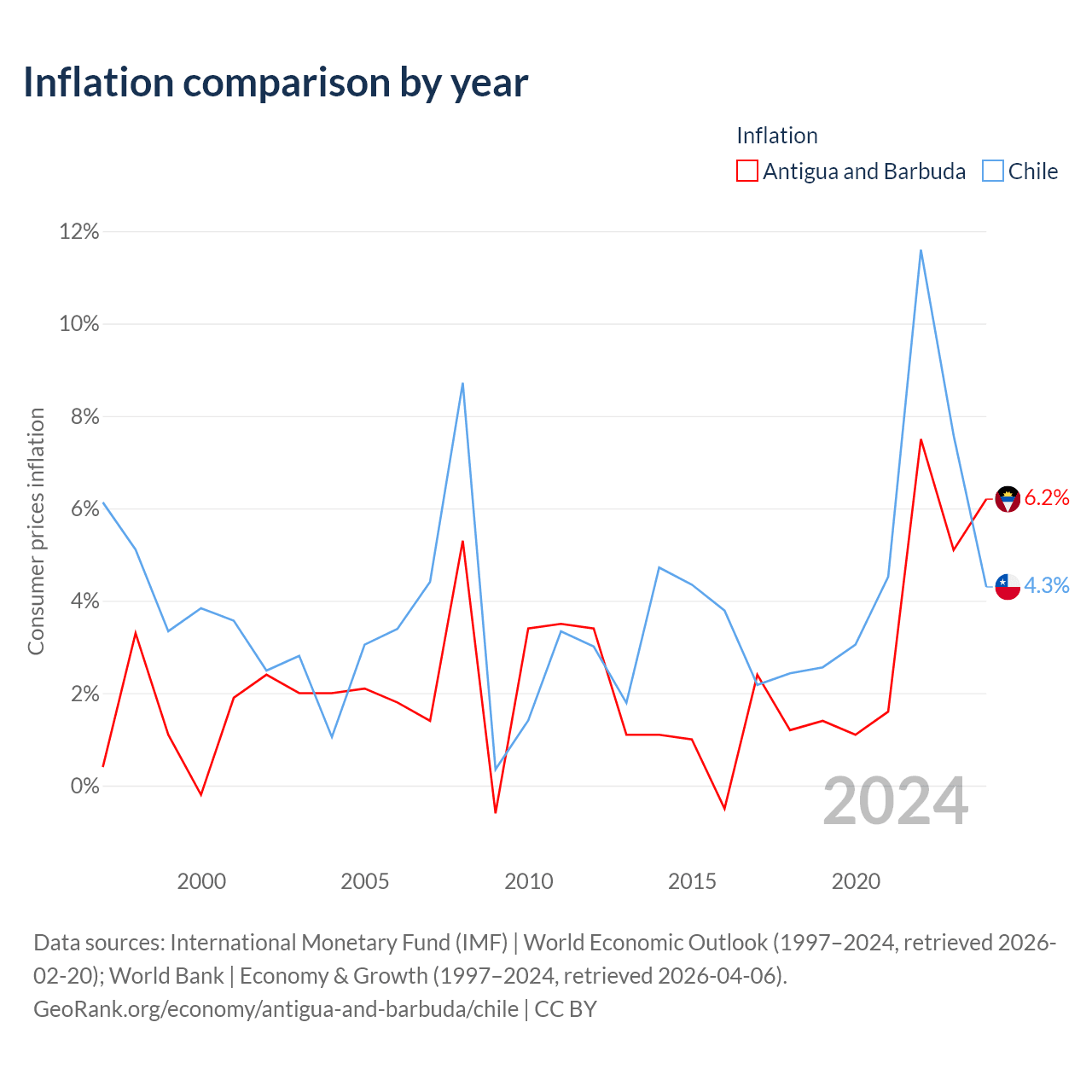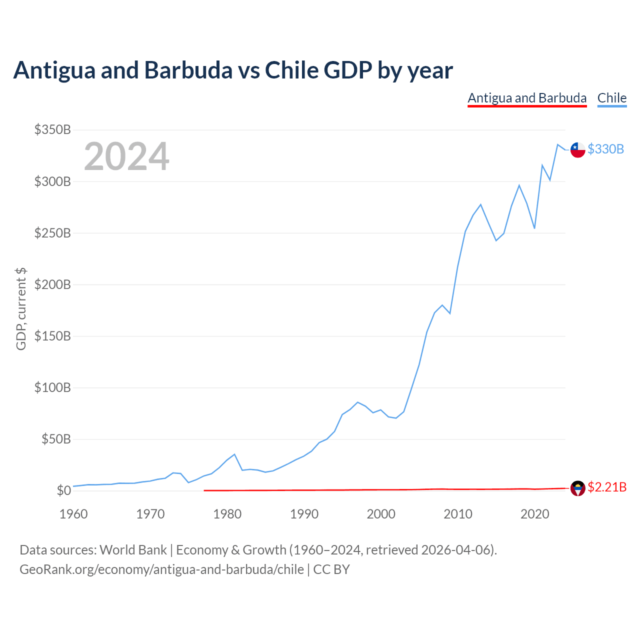 Antigua and Barbuda has a GDP of $2.21B compared to $330B for Chile, ranking 177/197 and 45/197 by economy size, respectively.