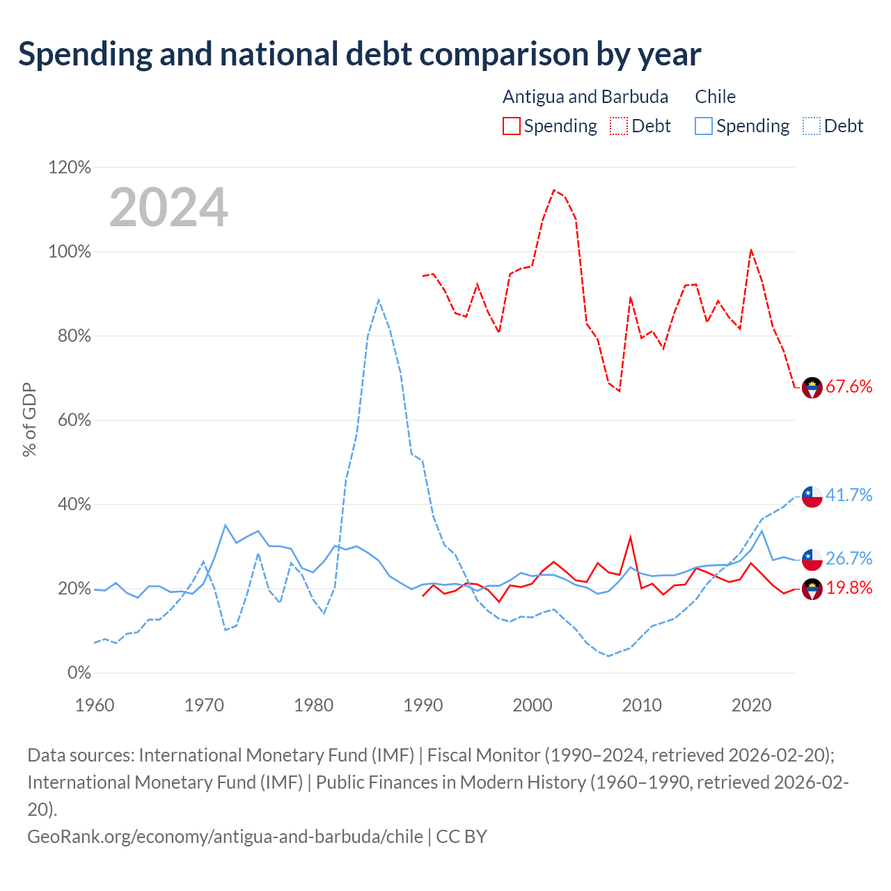 Antigua and Barbuda has $1.49B in government debt (67.6% of GDP), compared to $138B (41.7% of GDP) in Chile.