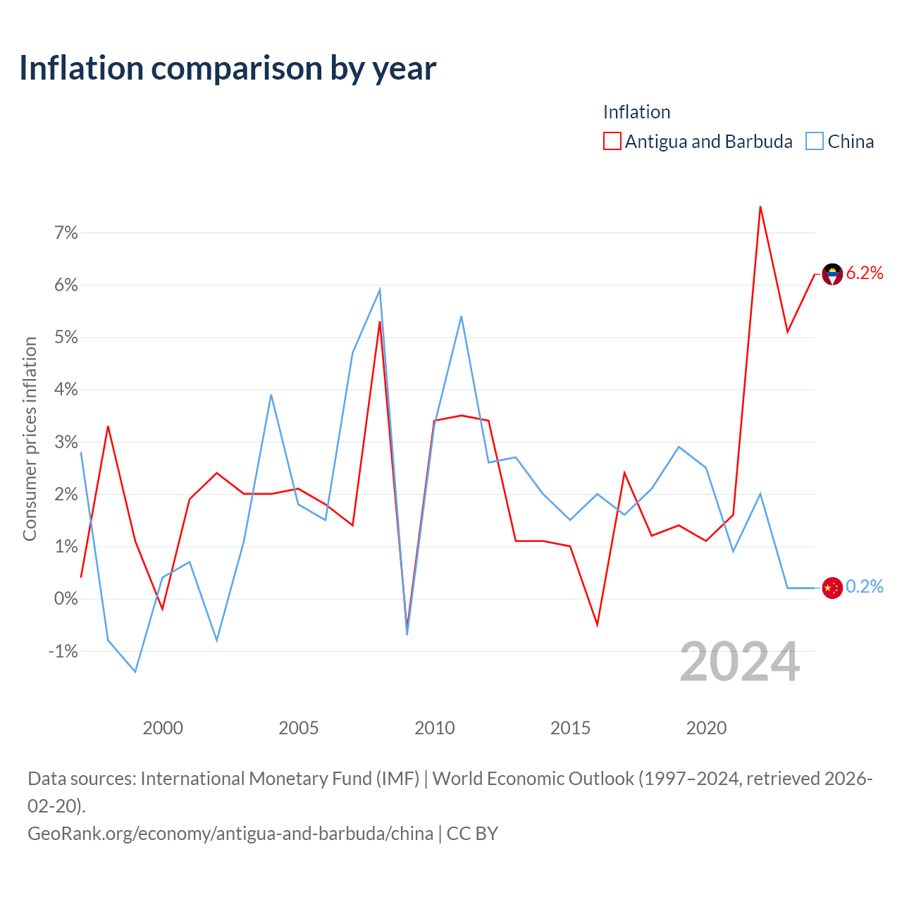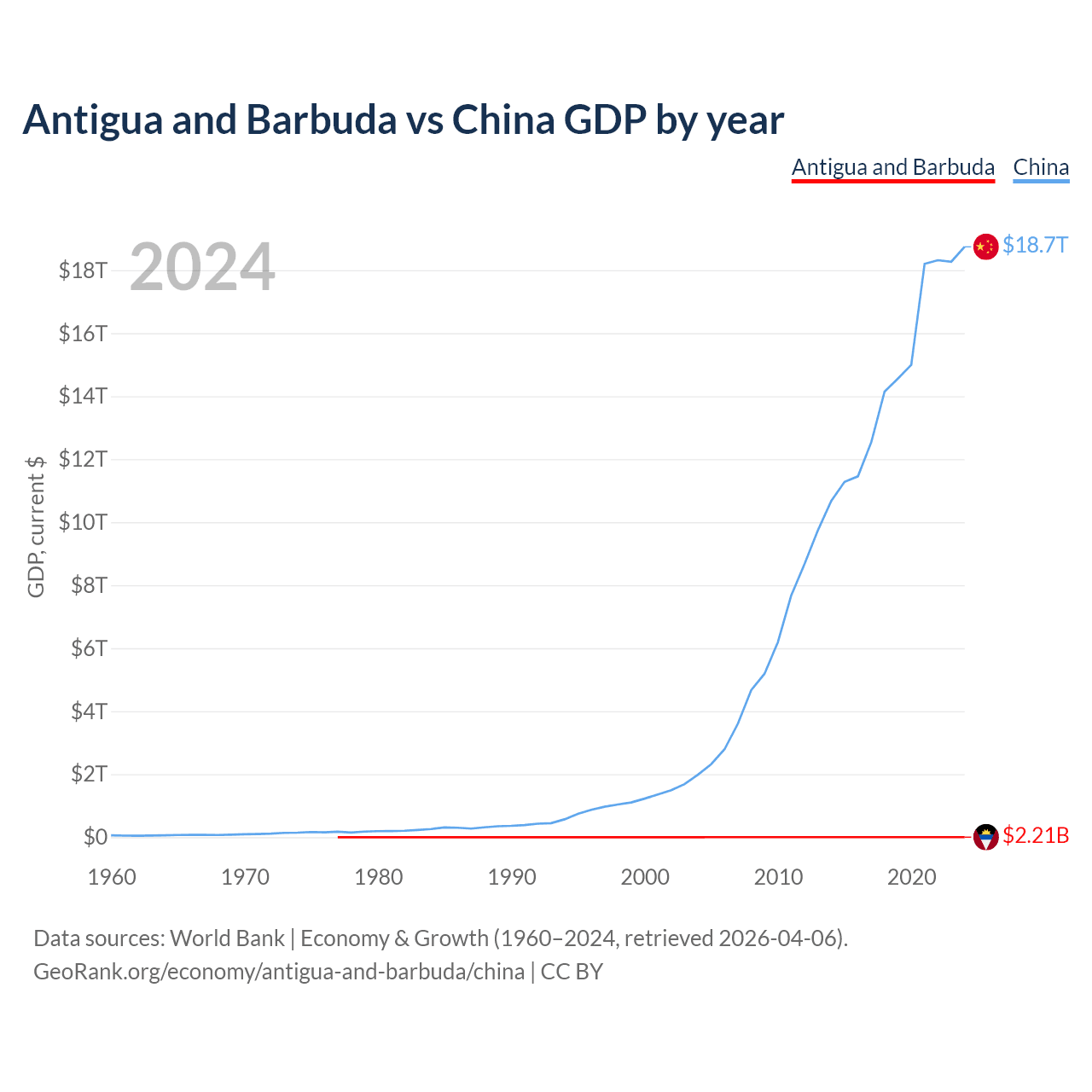 Antigua and Barbuda has a GDP of $2.21B compared to $18.7T for China, ranking 177/197 and 2/197 by economy size, respectively.