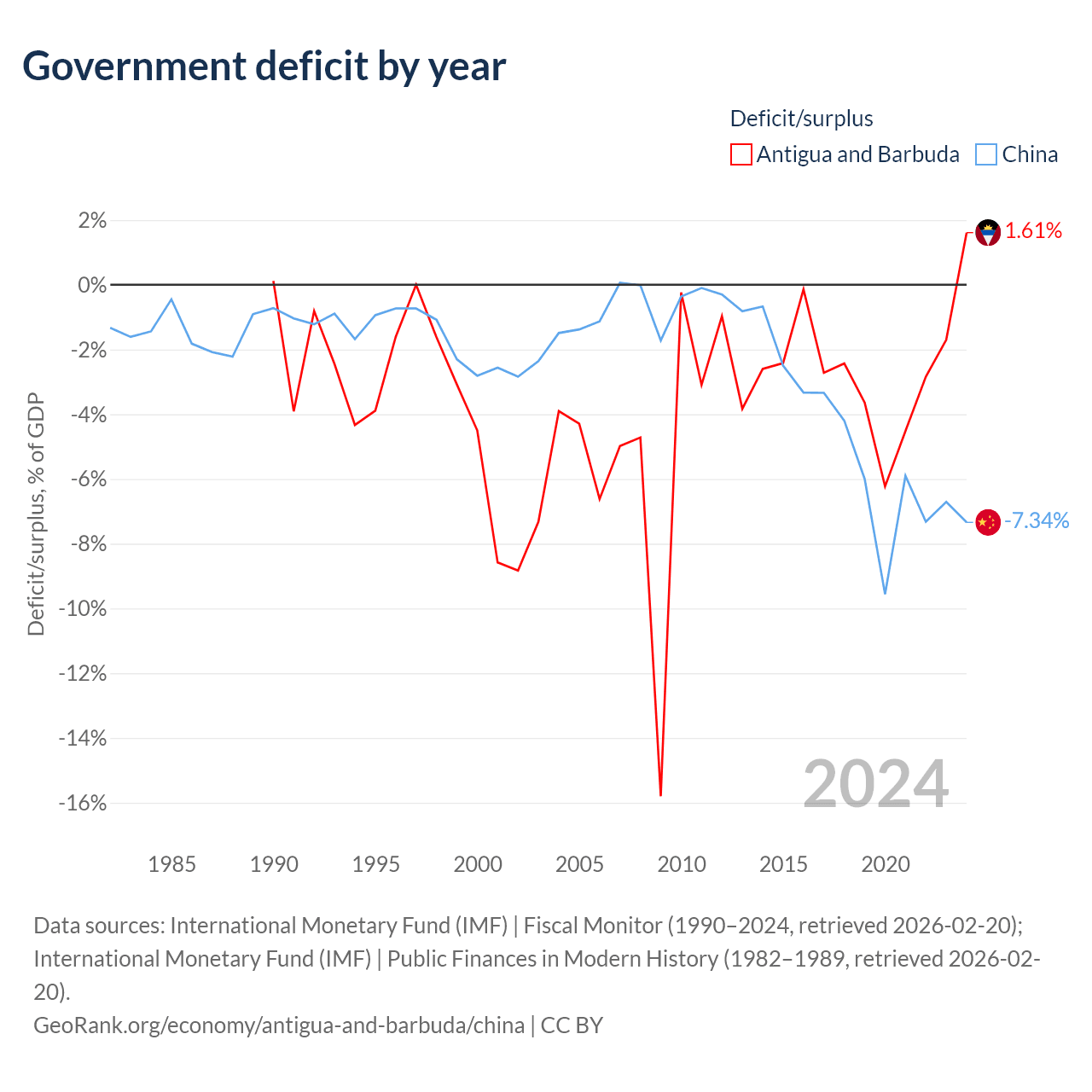 Antigua and Barbuda has $1.49B in government debt (67.6% of GDP), compared to $16.6T (88.3% of GDP) in China.