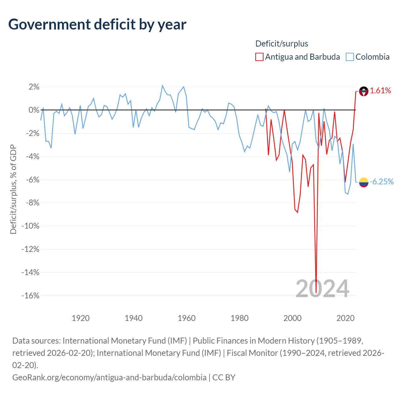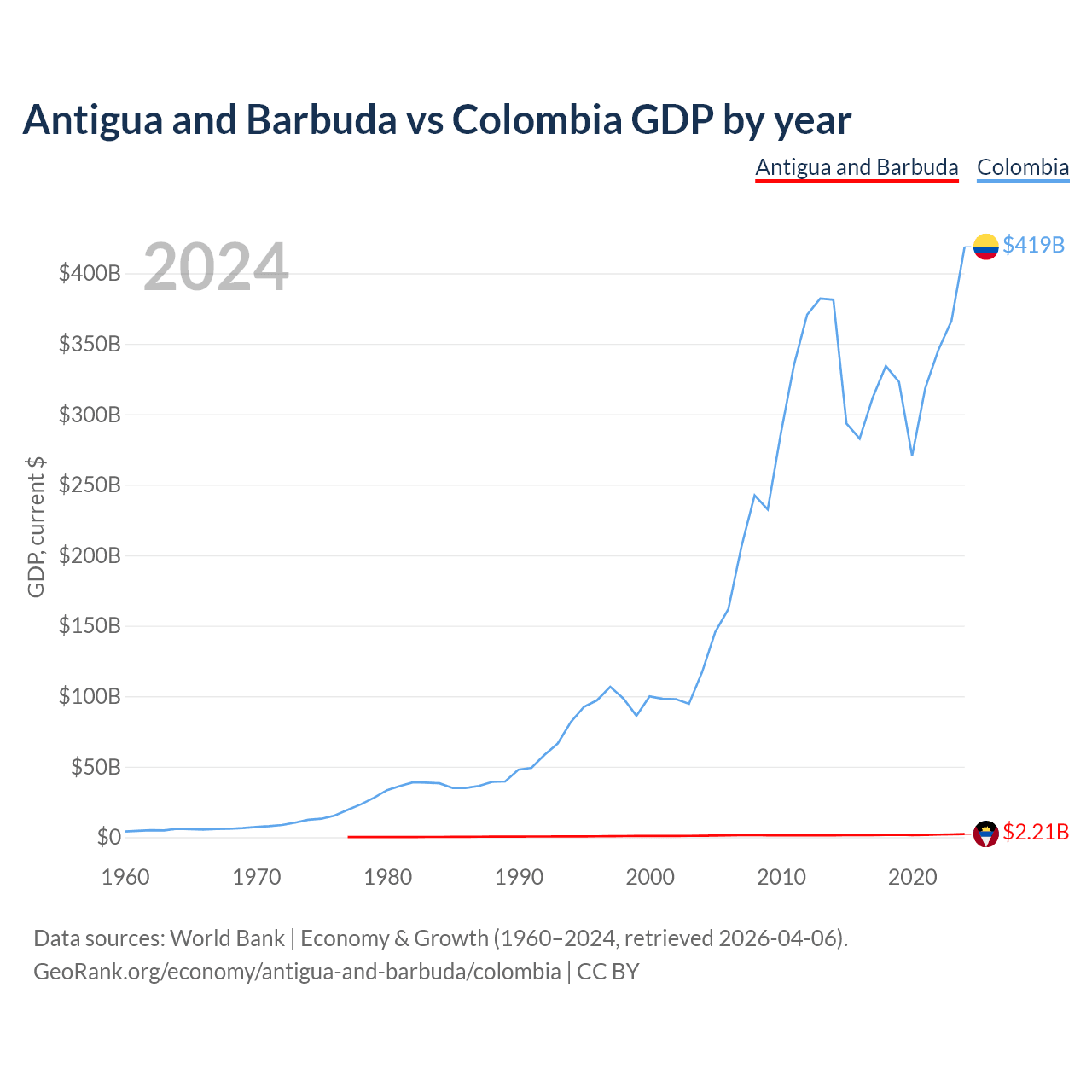 Antigua and Barbuda has a GDP of $2.21B compared to $419B for Colombia, ranking 177/197 and 39/197 by economy size, respectively.