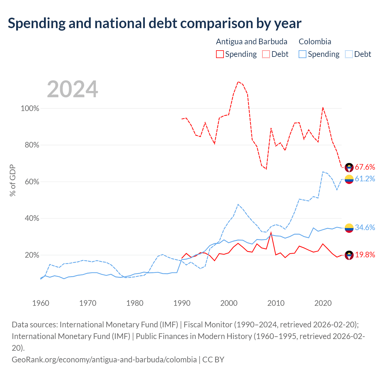 Antigua and Barbuda has $1.49B in government debt (67.6% of GDP), compared to $256B (61.2% of GDP) in Colombia.