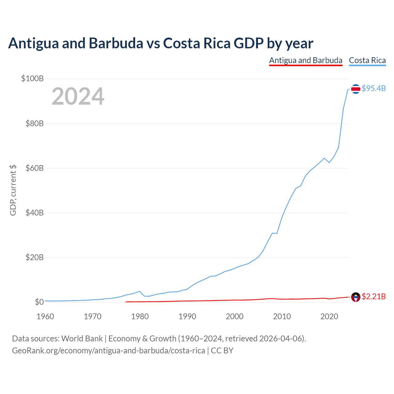 Antigua and Barbuda has a GDP of $2.21B compared to $95.4B for Costa Rica, ranking 177/197 and 73/197 by economy size, respectively.