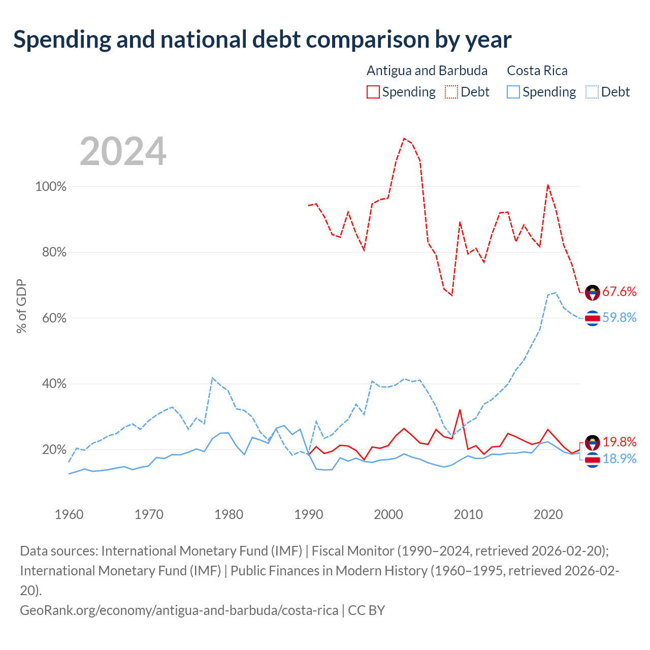 Antigua and Barbuda has $1.49B in government debt (67.6% of GDP), compared to $57B (59.8% of GDP) in Costa Rica.