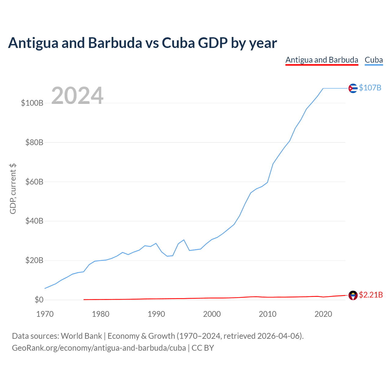 Antigua and Barbuda has a GDP of $2.21B compared to $107B for Cuba, ranking 177/197 and 69/197 by economy size, respectively.