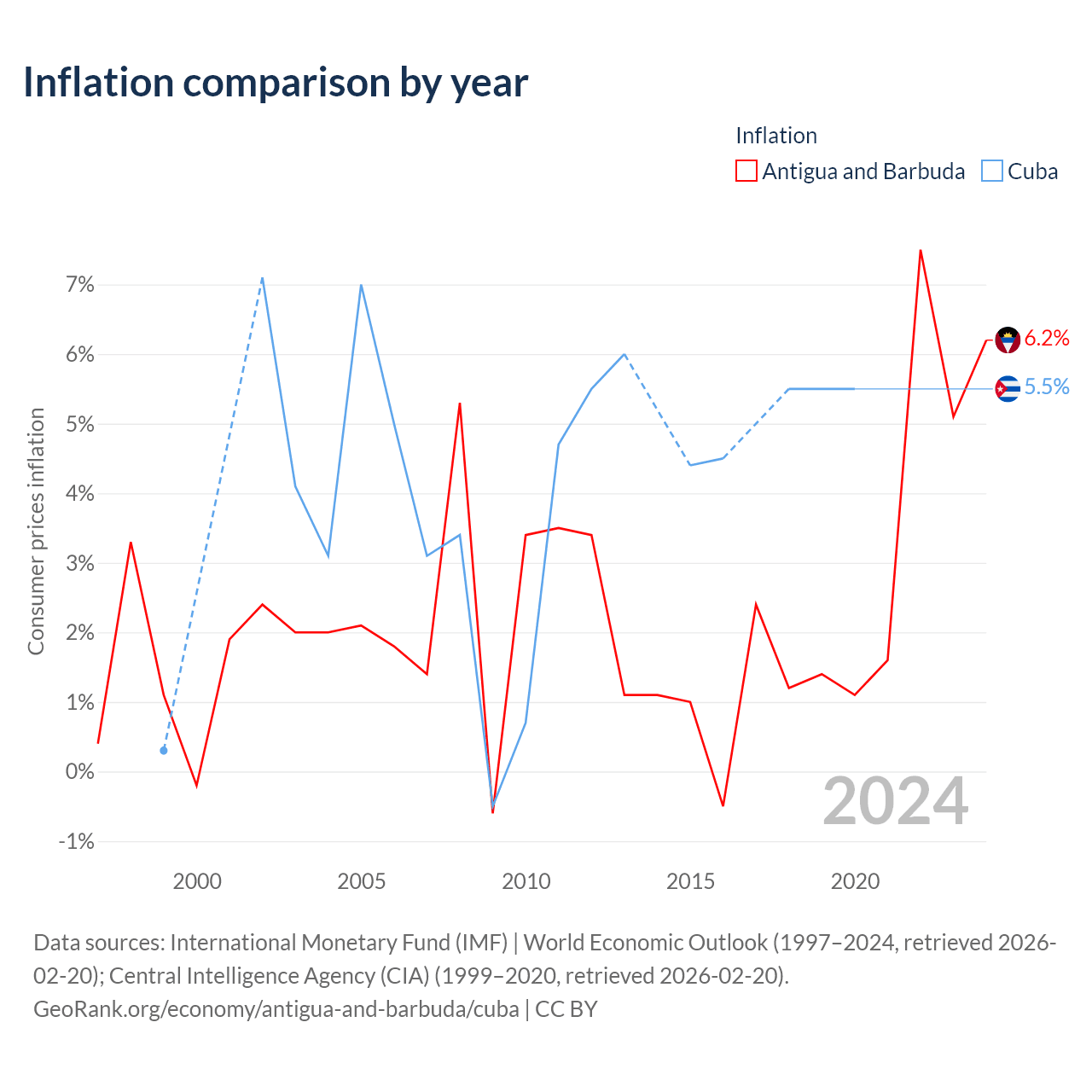 Over the past 22 years, Antigua and Barbuda has recorded an average annual inflation rate of 1.74%, compared with 4.16% in Cuba. In 2020, inflation was 6.2% in Antigua and Barbuda and 5.5% in Cuba.