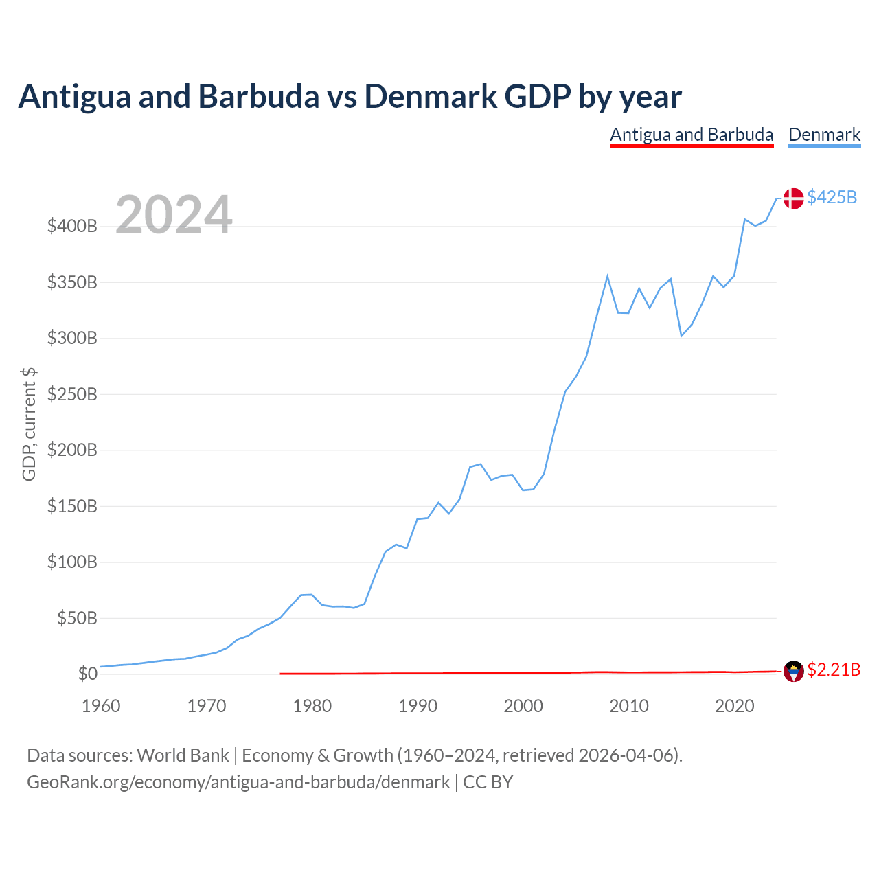 Antigua and Barbuda has a GDP of $2.21B compared to $425B for Denmark, ranking 177/197 and 37/197 by economy size, respectively.