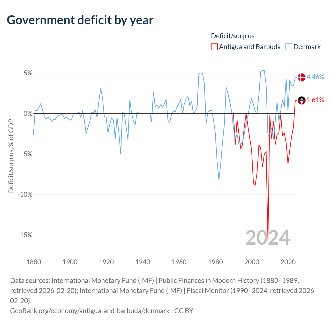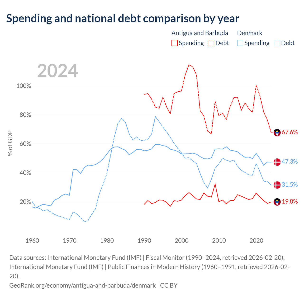 Antigua and Barbuda has $1.49B in government debt (67.6% of GDP), compared to $134B (31.5% of GDP) in Denmark.