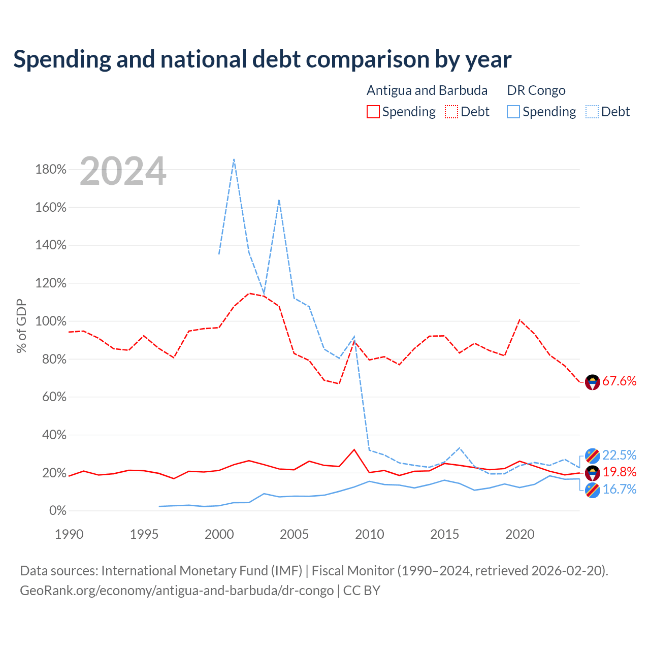 Antigua and Barbuda has $1.49B in government debt (67.6% of GDP), compared to $16B (22.5% of GDP) in the DR Congo.