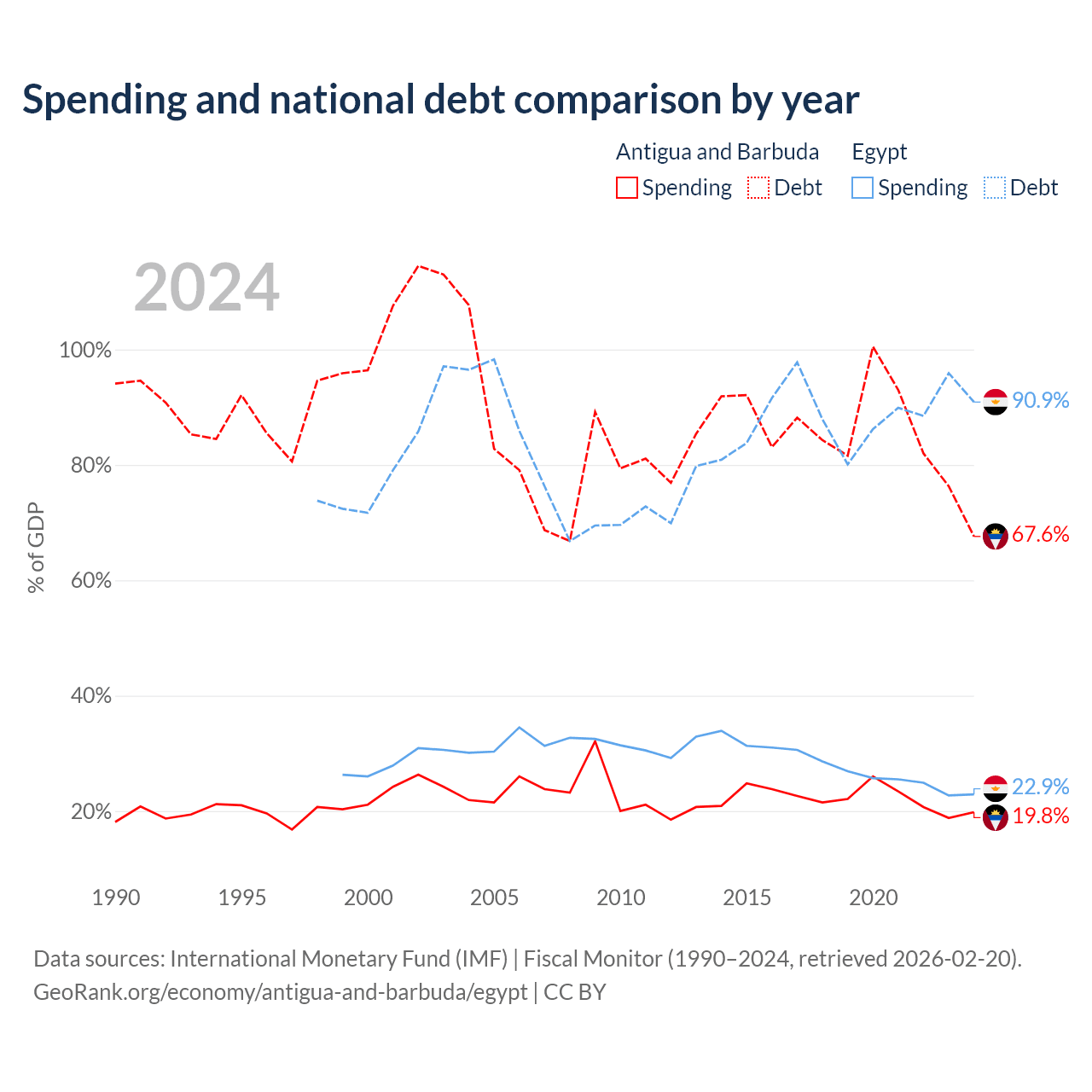 Antigua and Barbuda has $1.49B in government debt (67.6% of GDP), compared to $354B (90.9% of GDP) in Egypt.