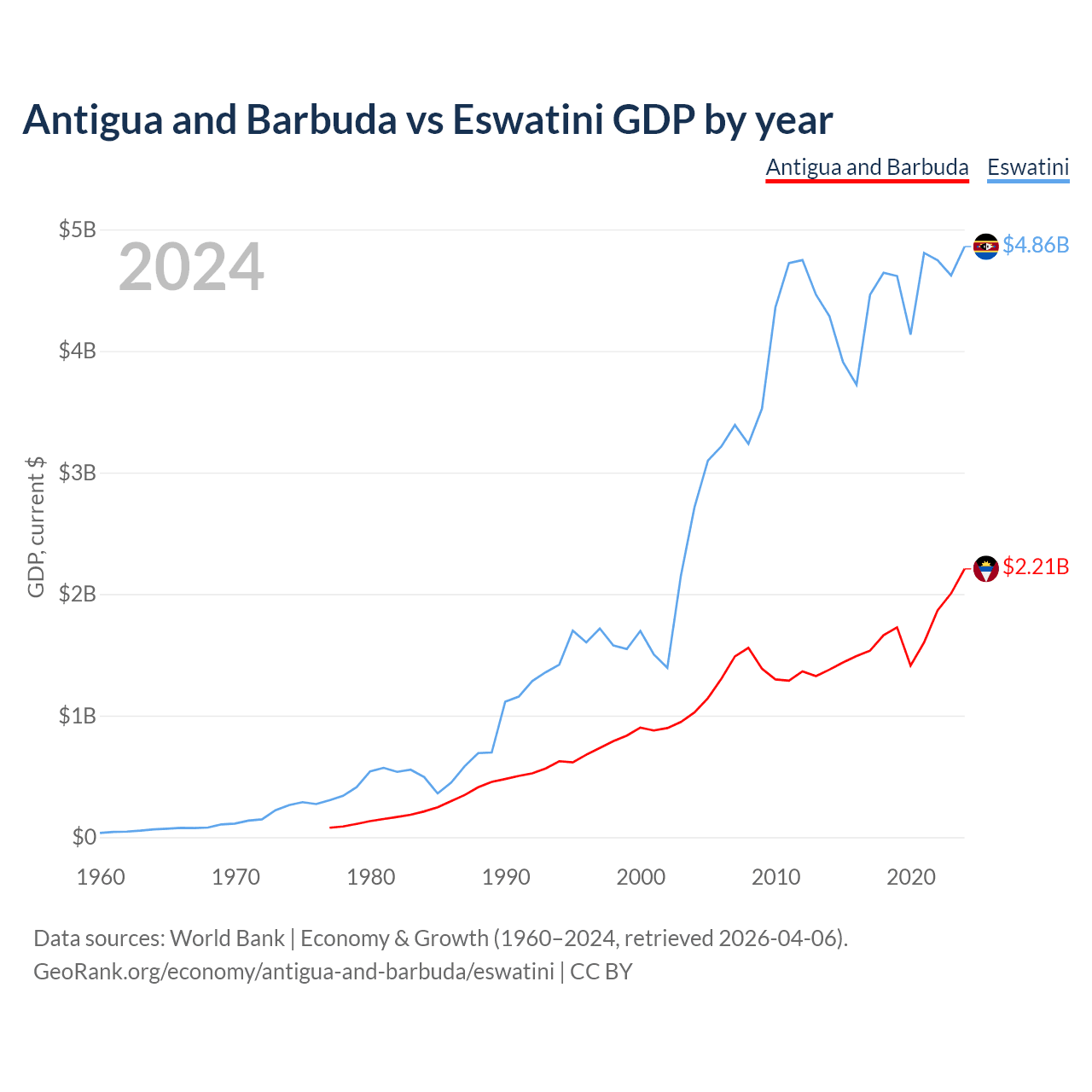 Antigua and Barbuda has a GDP of $2.21B compared to $4.86B for Eswatini, ranking 177/197 and 162/197 by economy size, respectively.