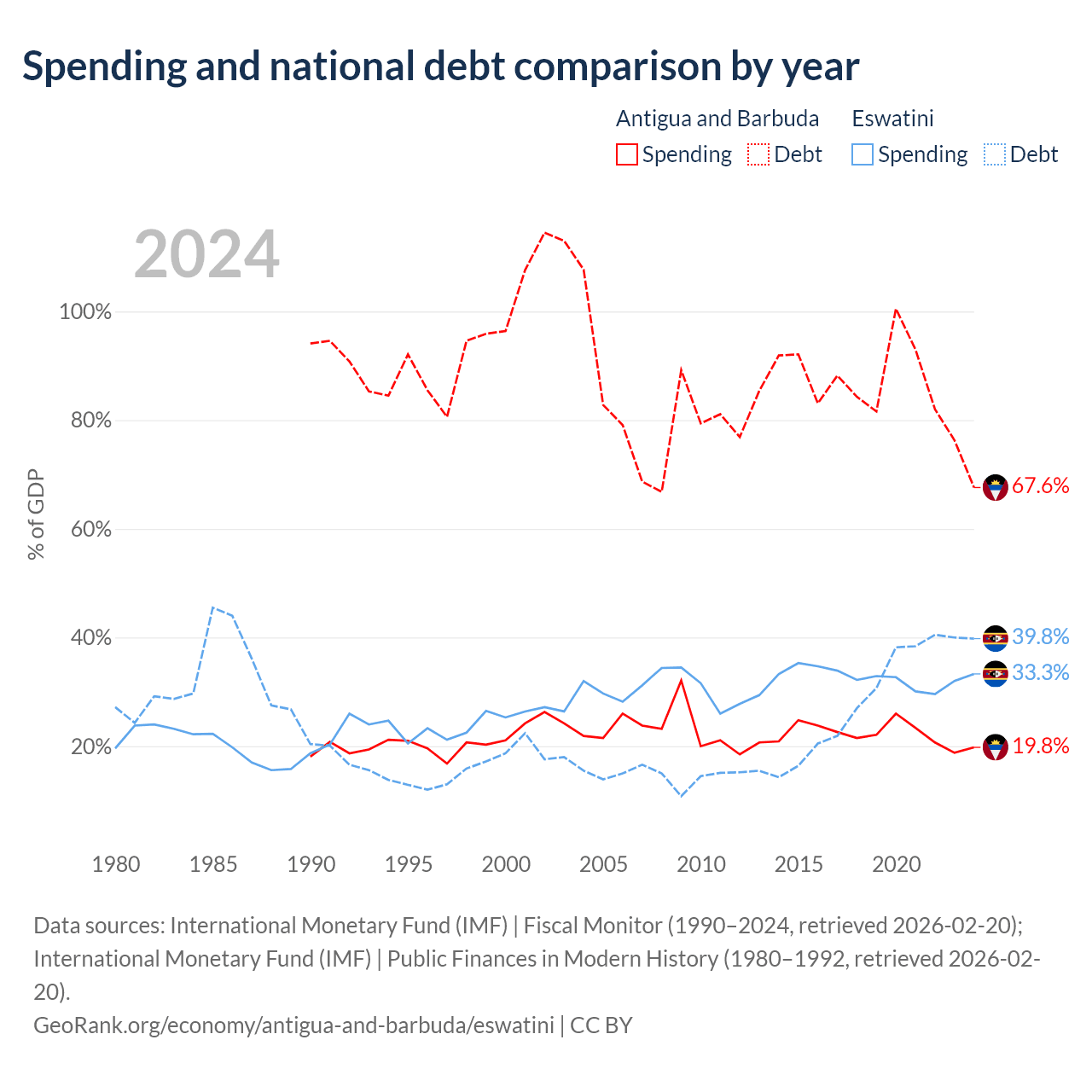 Antigua and Barbuda has $1.49B in government debt (67.6% of GDP), compared to $1.93B (39.8% of GDP) in Eswatini.