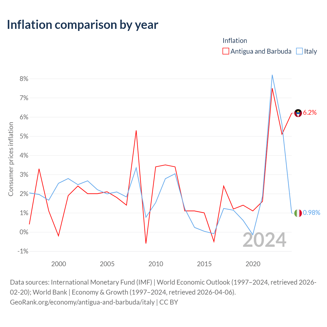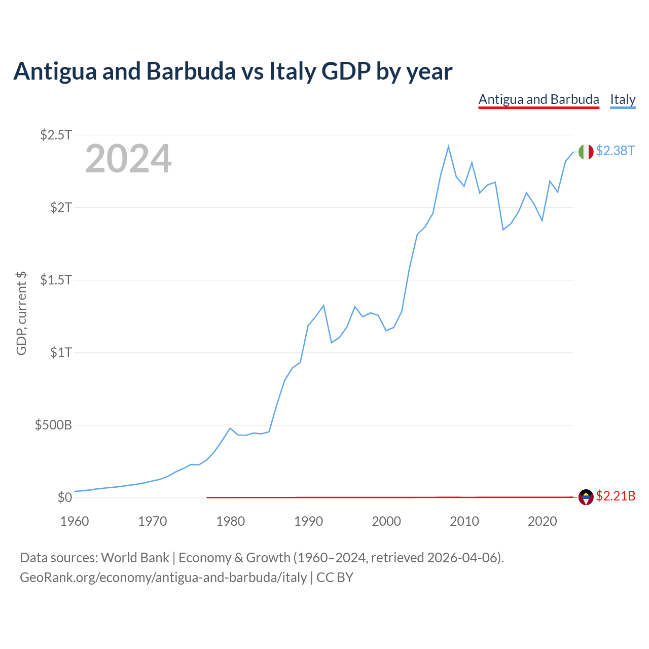 Antigua and Barbuda has a GDP of $2.21B compared to $2.38T for Italy, ranking 177/197 and 8/197 by economy size, respectively.