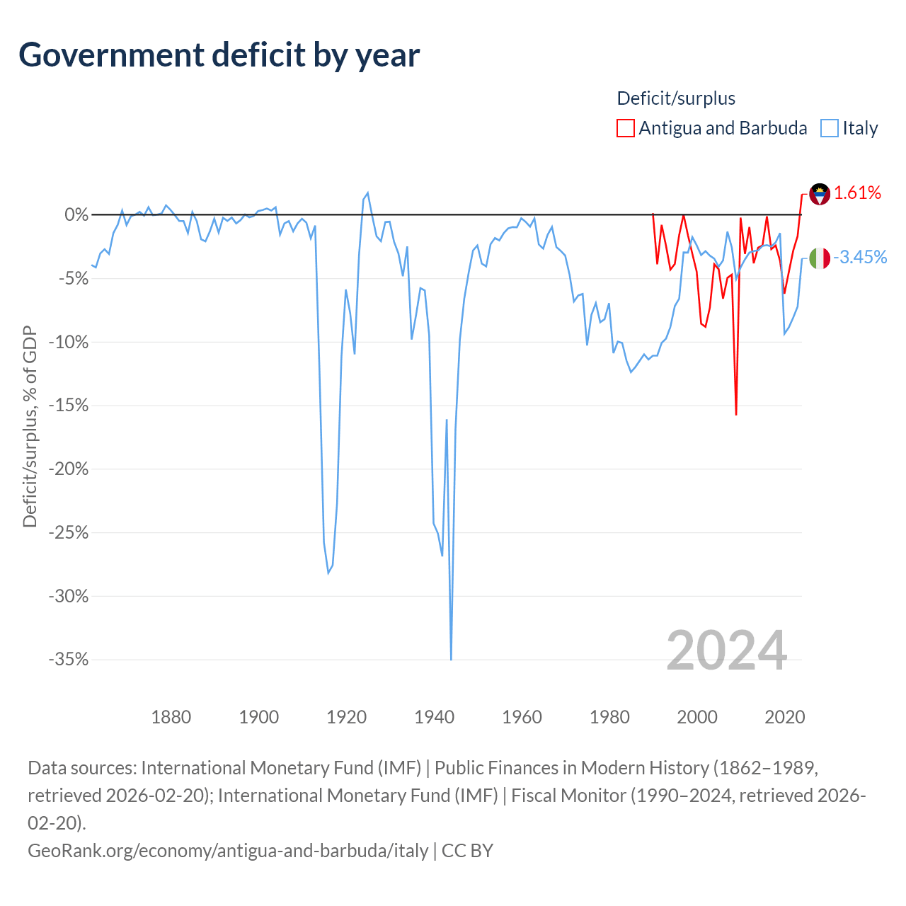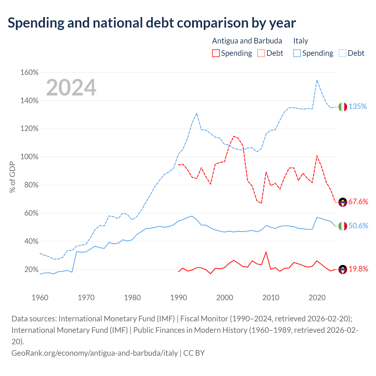 Antigua and Barbuda has $1.49B in government debt (67.6% of GDP), compared to $3.22T (135.3% of GDP) in Italy.