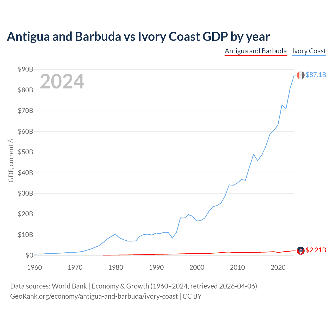 Antigua and Barbuda has a GDP of $2.21B compared to $87.1B for Ivory Coast, ranking 177/197 and 77/197 by economy size, respectively.