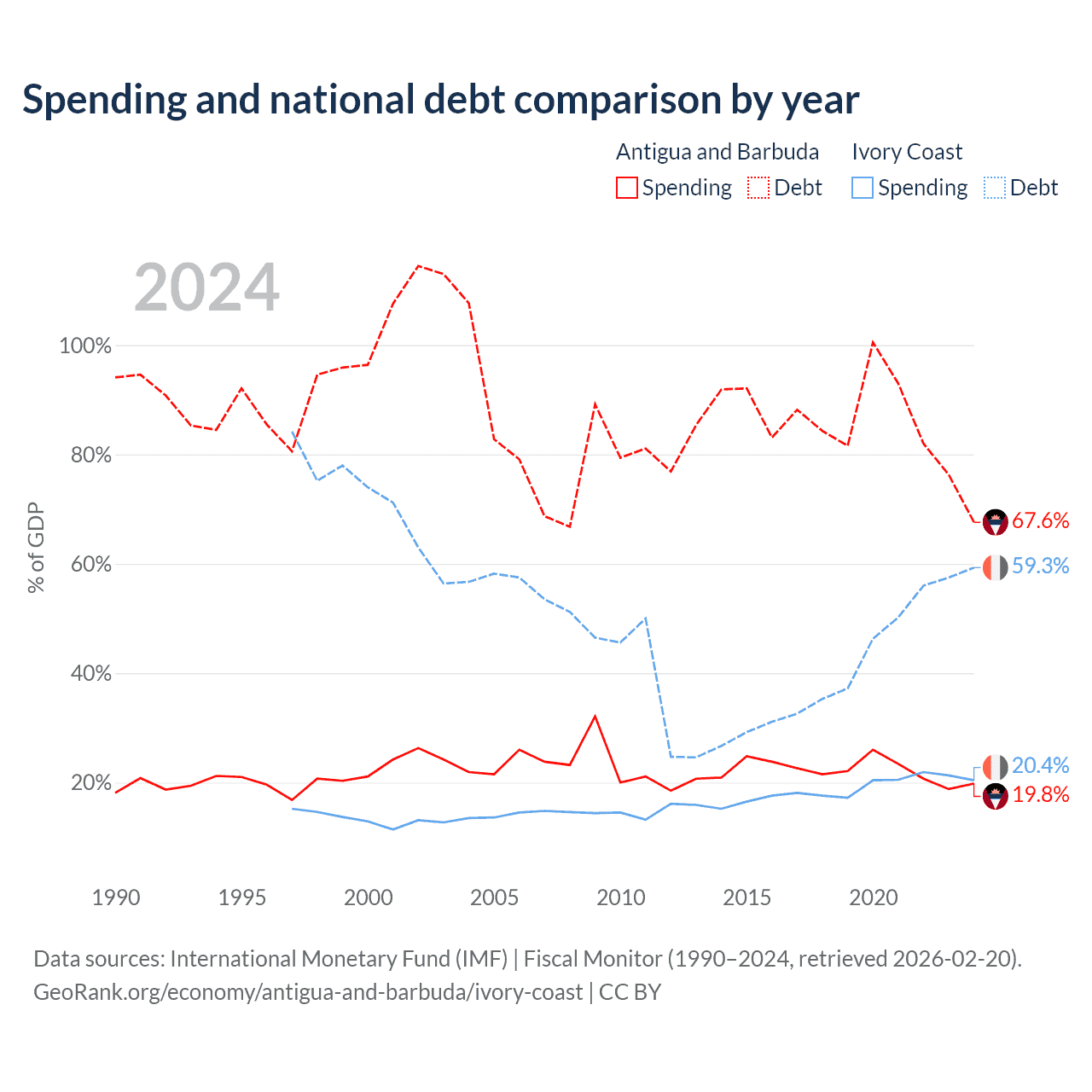 Antigua and Barbuda has $1.49B in government debt (67.6% of GDP), compared to $51.6B (59.3% of GDP) in Ivory Coast.