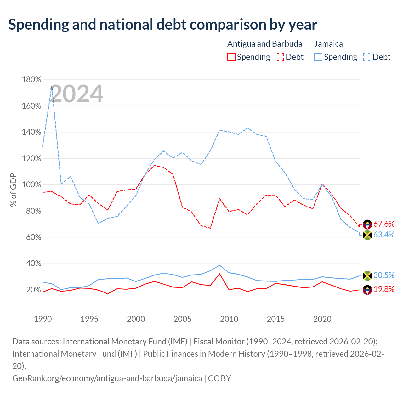 Antigua and Barbuda has $1.49B in government debt (67.6% of GDP), compared to $14B (63.4% of GDP) in Jamaica.