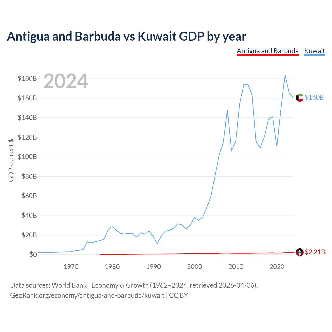 Antigua and Barbuda has a GDP of $2.21B compared to $160B for Kuwait, ranking 177/197 and 59/197 by economy size, respectively.