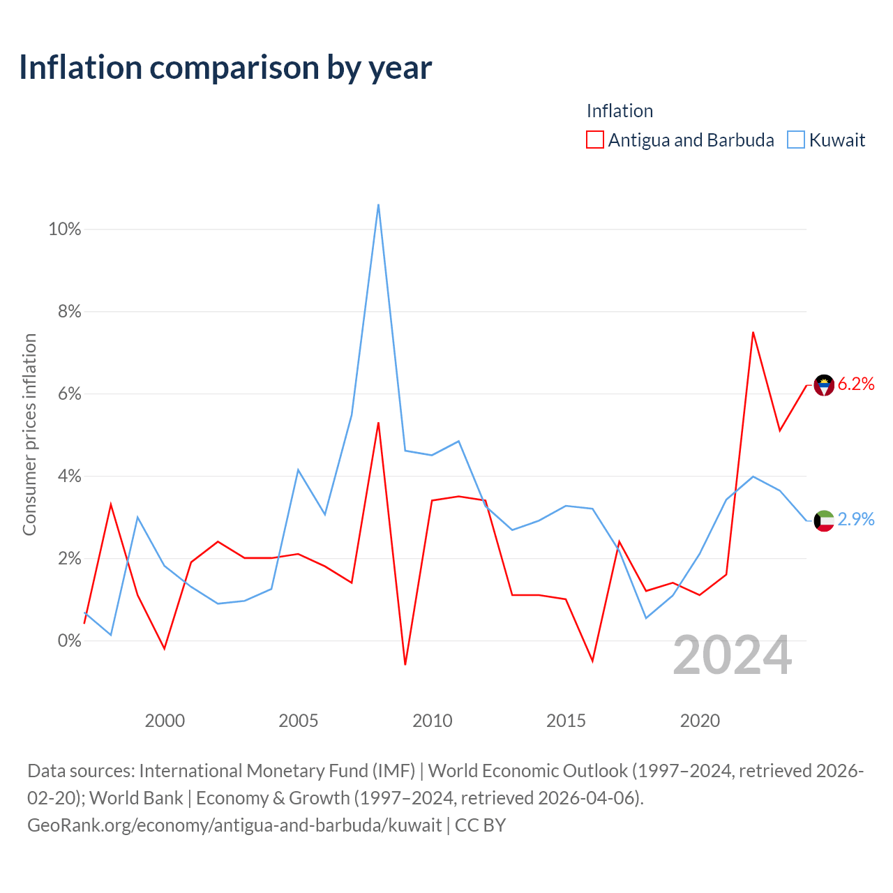 Over the past 28 years, Antigua and Barbuda has recorded an average annual inflation rate of 2.23%, compared with 2.94% in Kuwait. In 2024, inflation was 6.2% in Antigua and Barbuda and 2.9% in Kuwait.