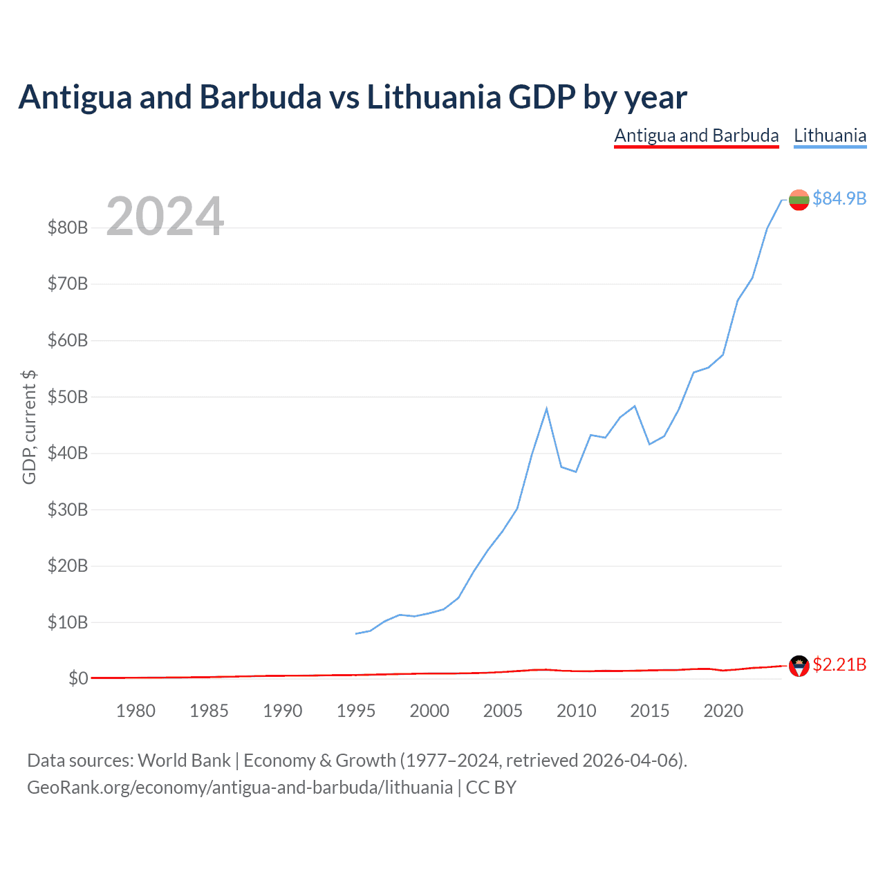 Antigua and Barbuda has a GDP of $2.21B compared to $84.9B for Lithuania, ranking 177/197 and 79/197 by economy size, respectively.