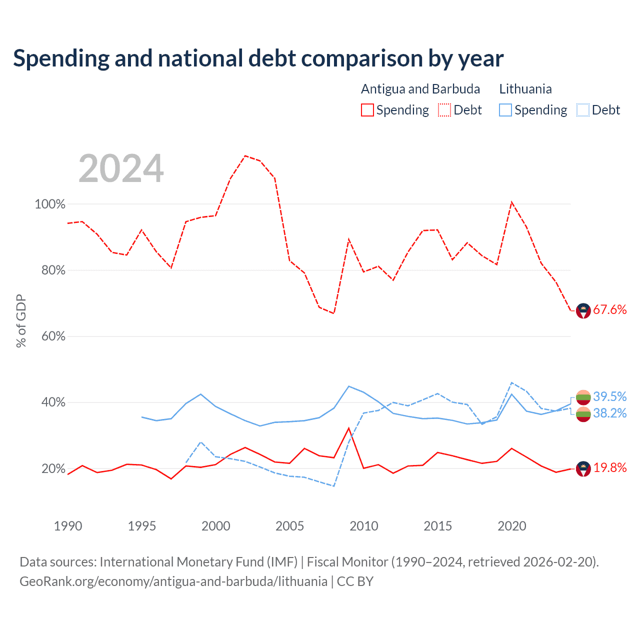Antigua and Barbuda has $1.49B in government debt (67.6% of GDP), compared to $32.4B (38.2% of GDP) in Lithuania.