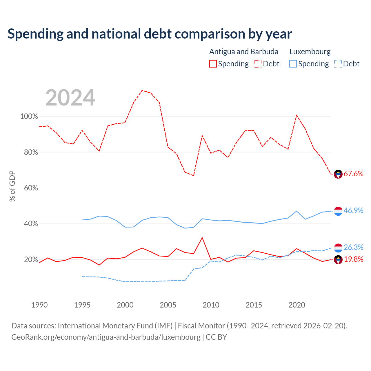 Antigua and Barbuda has $1.49B in government debt (67.6% of GDP), compared to $24.5B (26.3% of GDP) in Luxembourg.