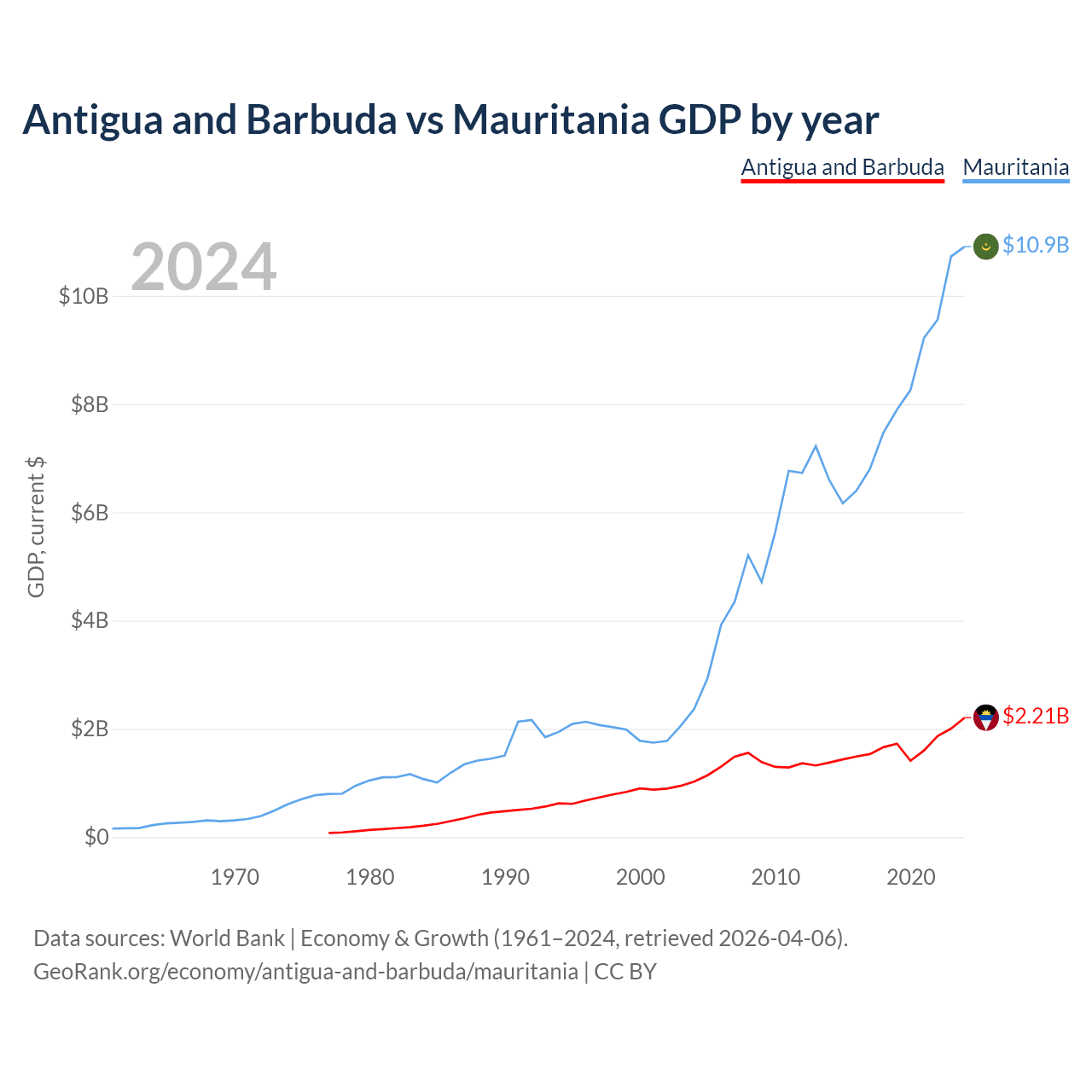 Antigua and Barbuda has a GDP of $2.21B compared to $10.9B for Mauritania, ranking 177/197 and 153/197 by economy size, respectively.