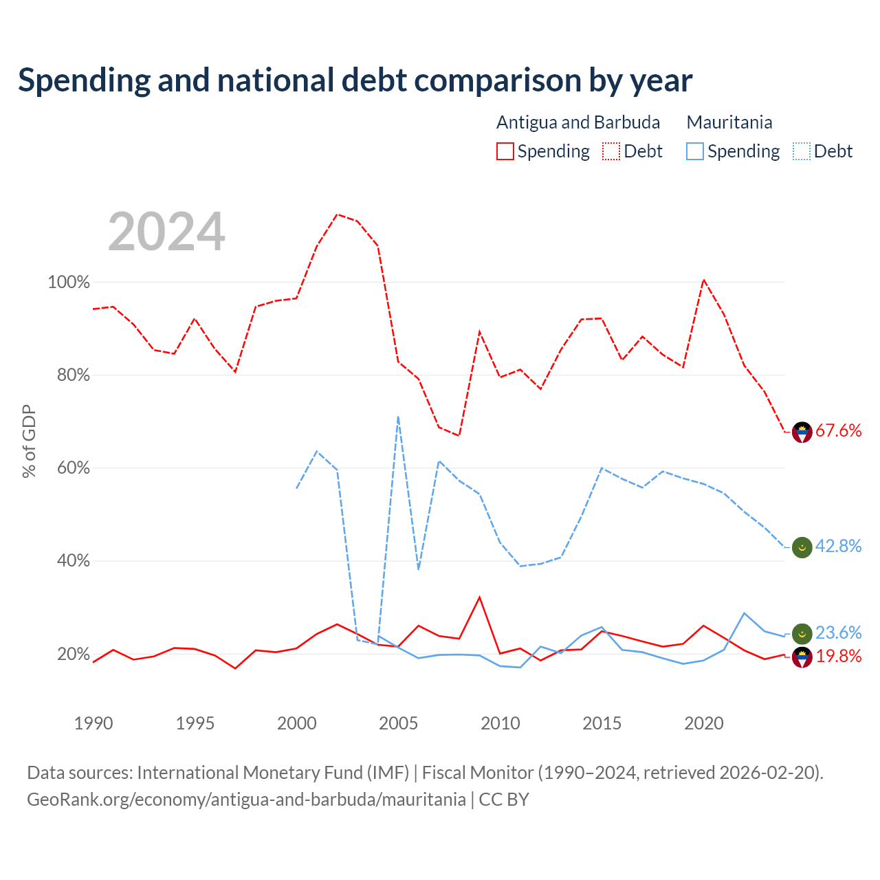 Antigua and Barbuda has $1.49B in government debt (67.6% of GDP), compared to $4.67B (42.8% of GDP) in Mauritania.