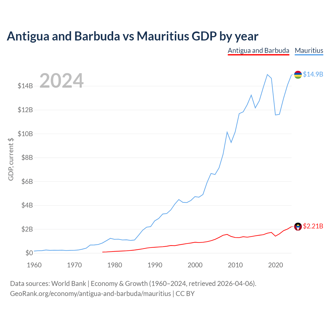 Antigua and Barbuda has a GDP of $2.21B compared to $14.9B for Mauritius, ranking 177/197 and 143/197 by economy size, respectively.