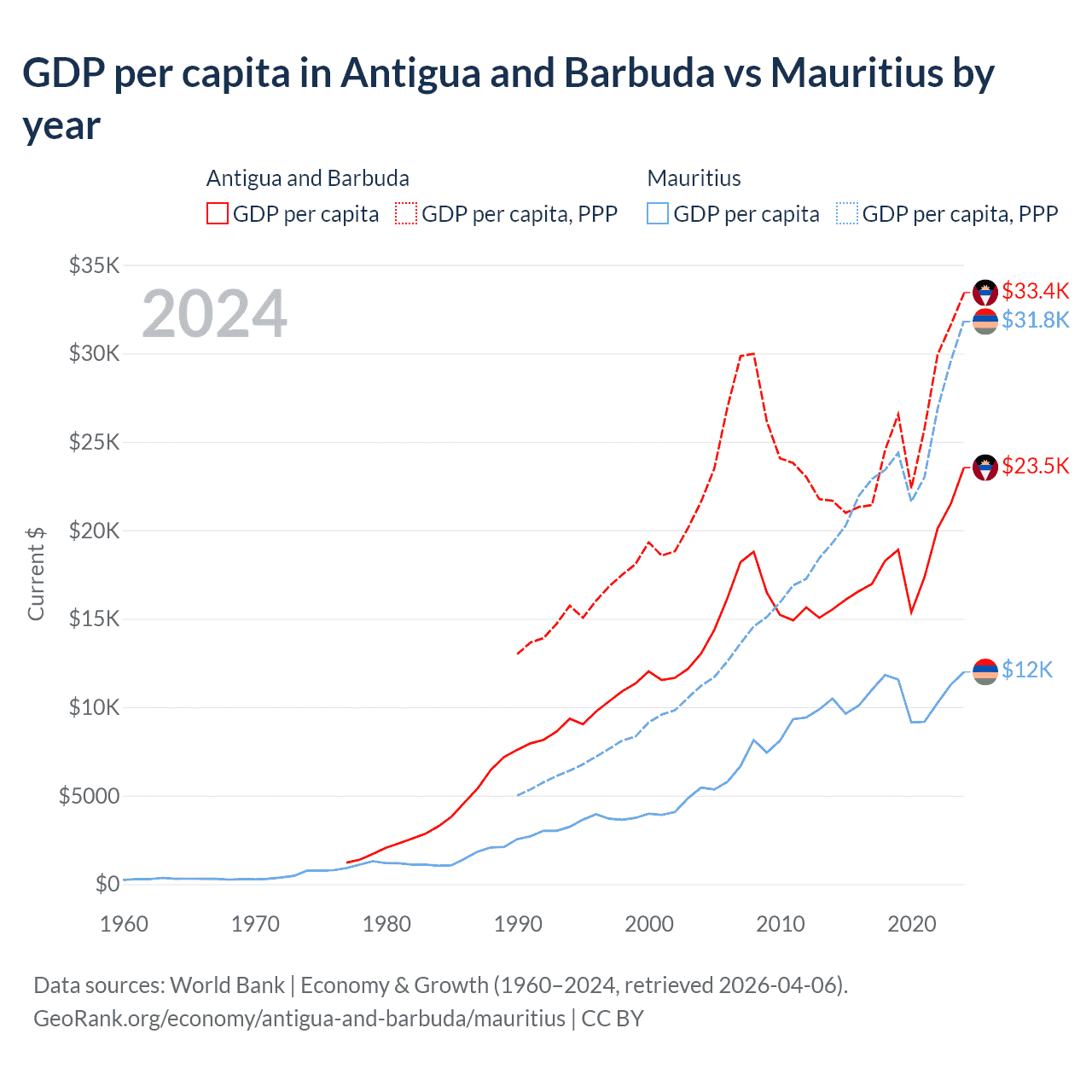 GDP per capita in Antigua and Barbuda vs Mauritius by year