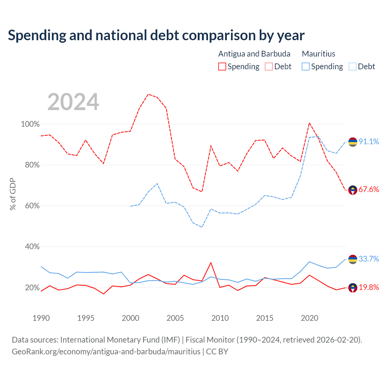 Antigua and Barbuda has $1.49B in government debt (67.6% of GDP), compared to $13.6B (91.1% of GDP) in Mauritius.