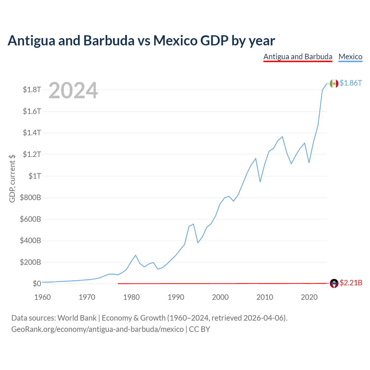 Antigua and Barbuda has a GDP of $2.21B compared to $1.86T for Mexico, ranking 177/197 and 13/197 by economy size, respectively.