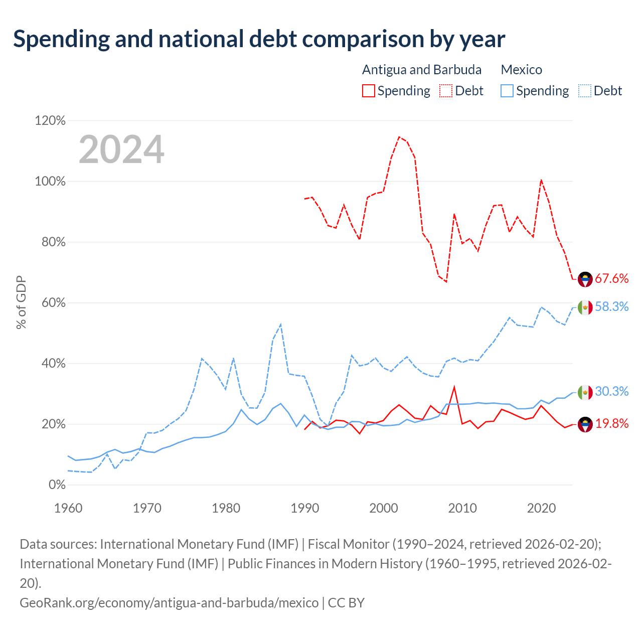 Antigua and Barbuda has $1.49B in government debt (67.6% of GDP), compared to $1.08T (58.3% of GDP) in Mexico.