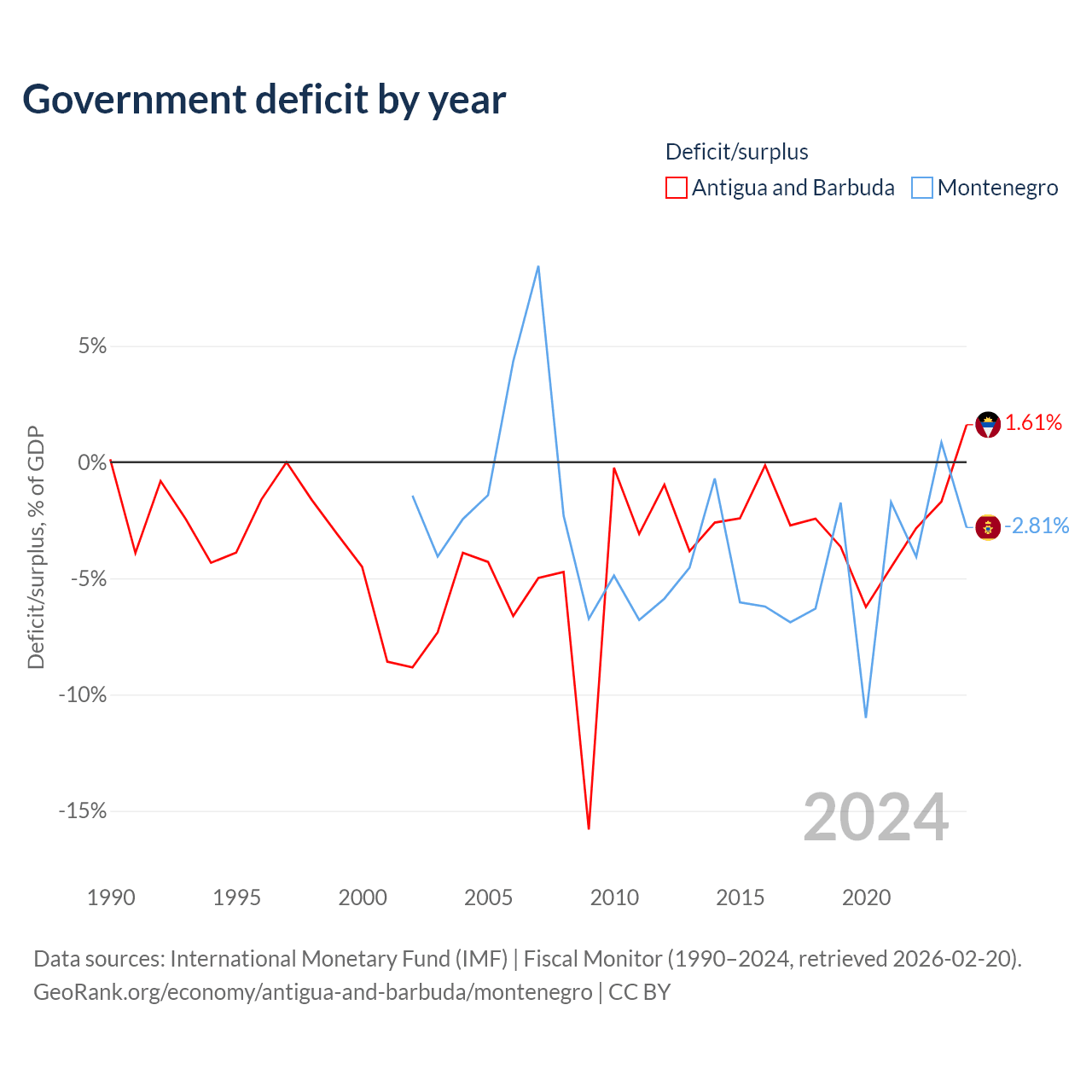 Antigua and Barbuda has a GDP of $2.21B compared to $8.27B for Montenegro, ranking 177/197 and 155/197 by economy size, respectively.