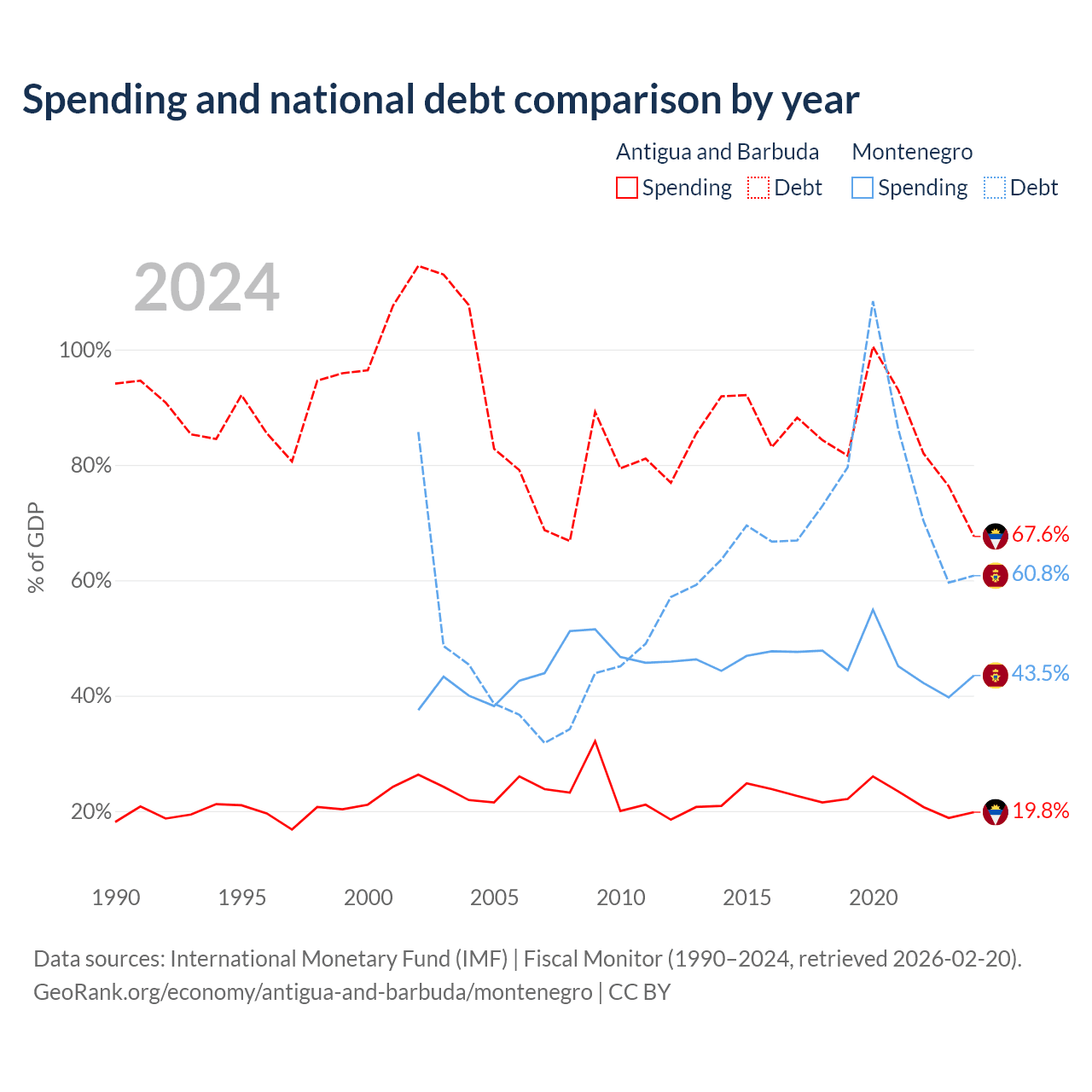 Antigua and Barbuda has $1.49B in government debt (67.6% of GDP), compared to $5.02B (60.8% of GDP) in Montenegro.