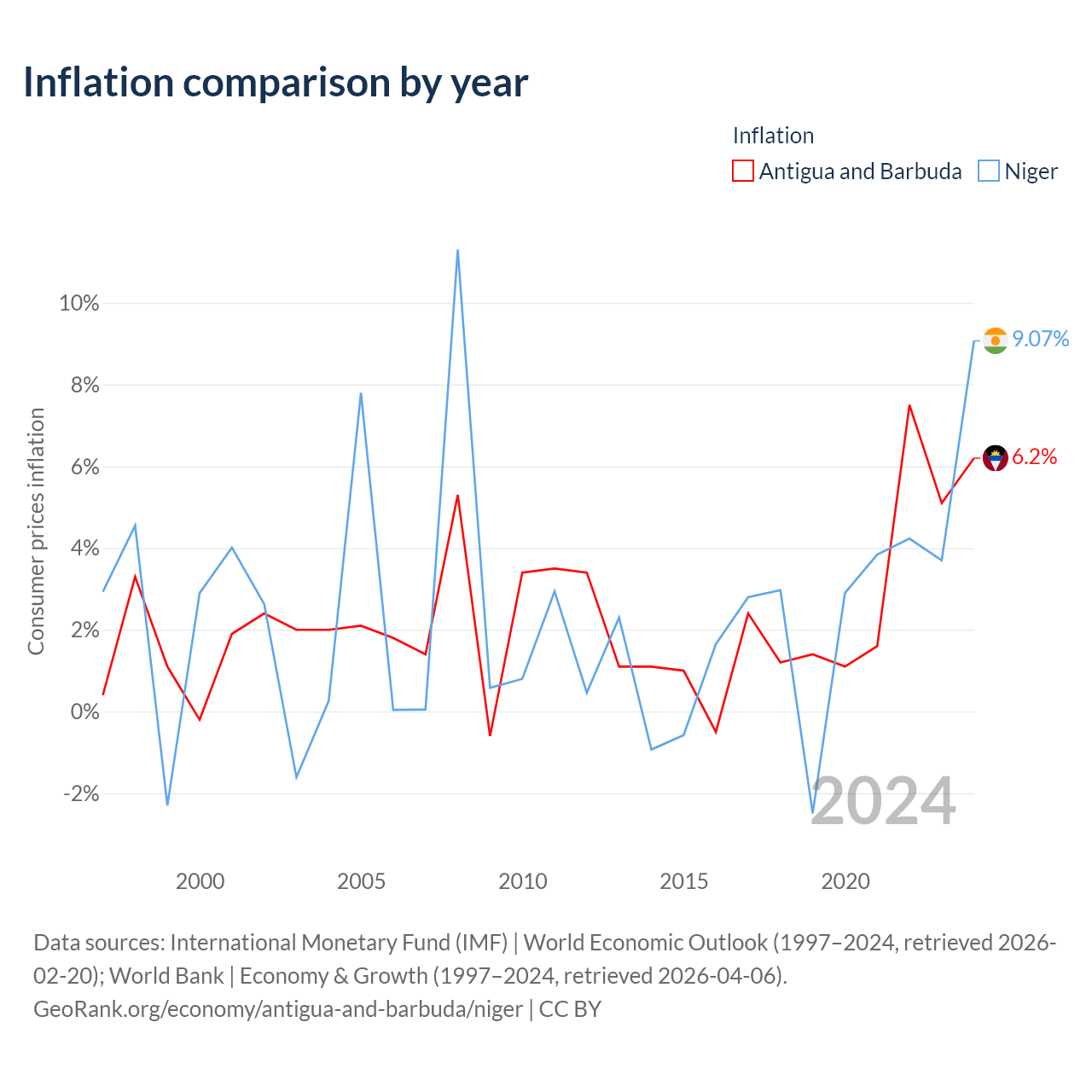 Over the past 28 years, Antigua and Barbuda has recorded an average annual inflation rate of 2.23%, compared with 2.39% in Niger. In 2024, inflation was 6.2% in Antigua and Barbuda and 9.07% in Niger.