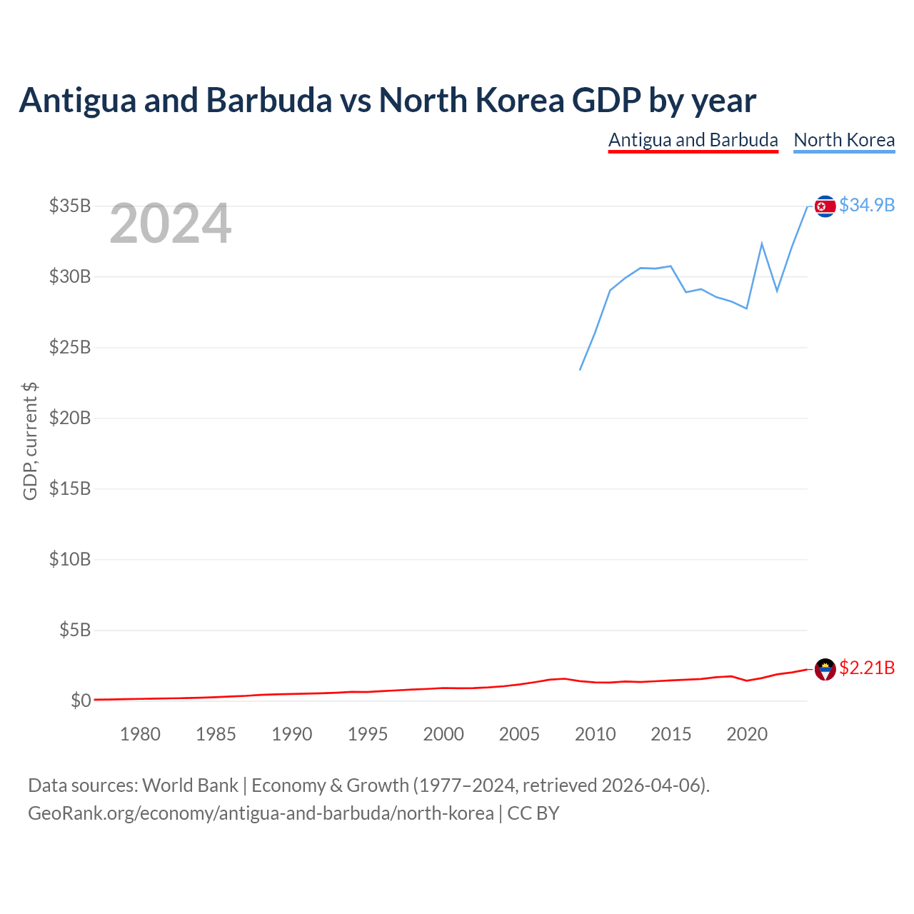 Antigua and Barbuda has a GDP of $2.21B compared to $34.9B for North Korea, ranking 177/197 and 106/197 by economy size, respectively.