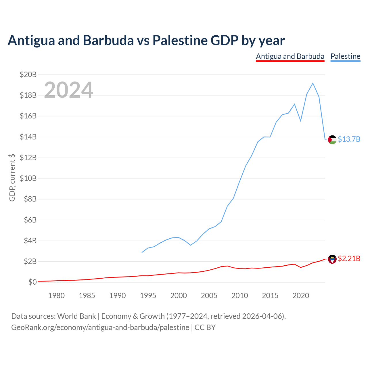 Antigua and Barbuda has a GDP of $2.21B compared to $13.7B for Palestine, ranking 177/197 and 146/197 by economy size, respectively.